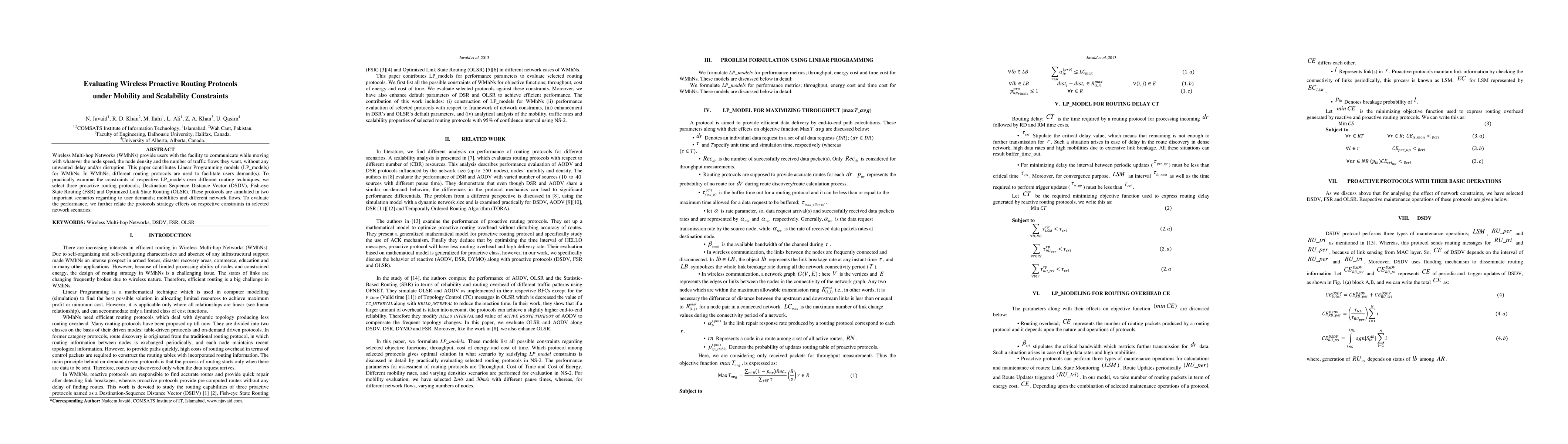 This paper evaluates the performance of three proactive routing protocols—DSDV, FSR, and OLSR—in Wireless Multi-hop Networks (WMhNs) using Linear Programming models. The study simulates these protocols under varying mobility and network flow conditions to assess their effectiveness and scalability constraints.