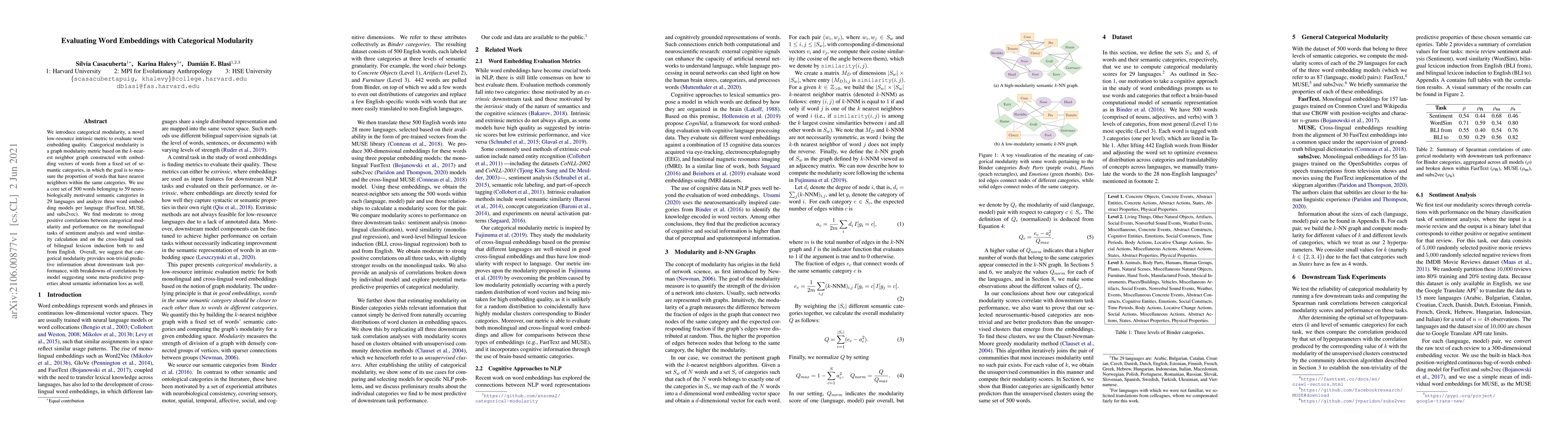 The paper introduces 'categorical modularity', a new metric to assess word embedding quality using a k-nearest neighbor graph based on semantic categories. It shows moderate to strong correlations between this metric and performance on various language tasks, suggesting categorical modularity predicts downstream task effectiveness and offers insights into semantic information preservation in word embeddings.