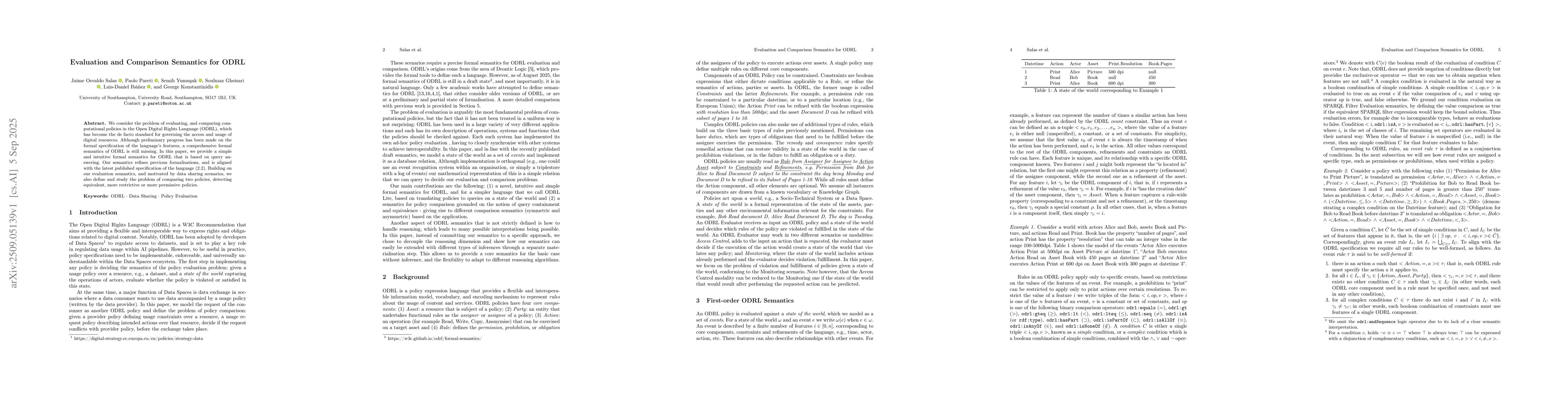 We consider the problem of evaluating, and comparing computational policies in the Open Digital Rights Language (ODRL), which has become the de facto standard for governing the access and usage of digital resources. Although preliminary progress has been made on the formal specification of the language's features, a comprehensive formal semantics of ODRL is still missing. In this paper, we provide a simple and intuitive formal semantics for ODRL that is based on query answering. Our semantics refines previous formalisations, and is aligned with the latest published specification of the language (2.2). Building on our evaluation semantics, and motivated by data sharing scenarios, we also define and study the problem of comparing two policies, detecting equivalent, more restrictive or more permissive policies.
