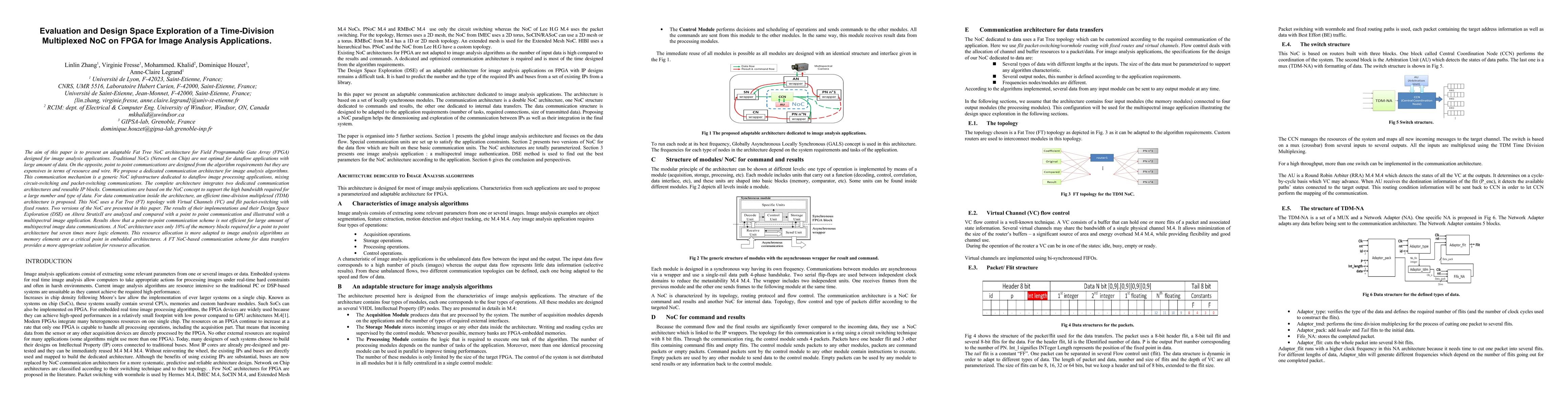 This paper proposes an adaptable Fat Tree NoC architecture for FPGAs to optimize image analysis applications, combining circuit-switching and packet-switching for high bandwidth dataflow, and integrating reusable IP blocks to reduce resource costs. The design aims to overcome the inefficiencies of traditional NoCs and point-to-point communications.