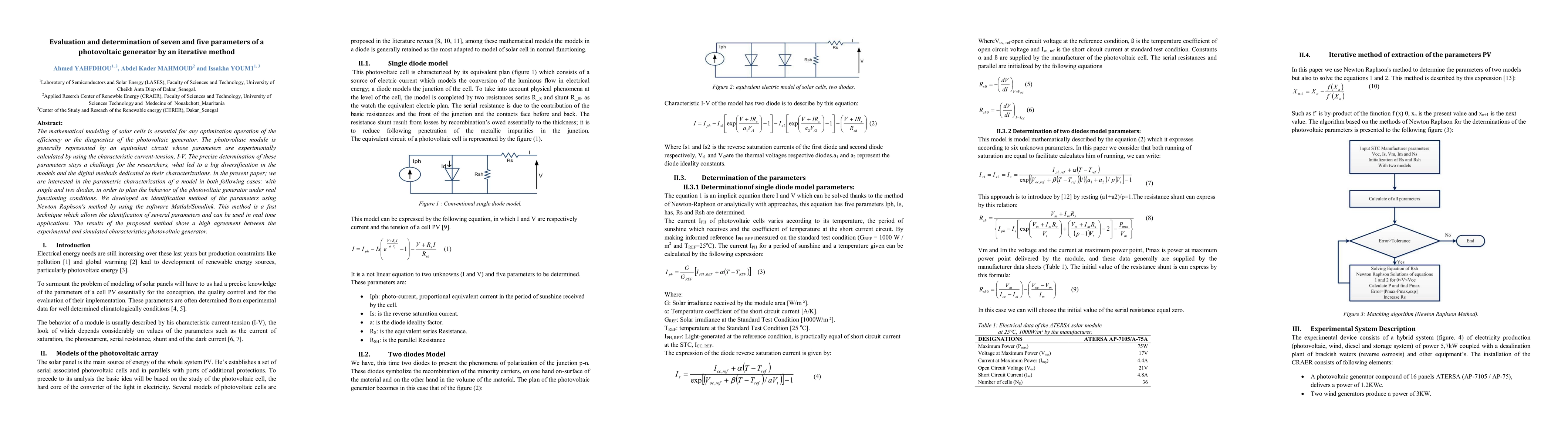 This paper presents a method for determining the parameters of a photovoltaic generator using Newton Raphson's iterative technique in Matlab/Simulink, aiming to model both single and two diode configurations. The proposed method shows high accuracy in matching experimental and simulated I-V characteristics.