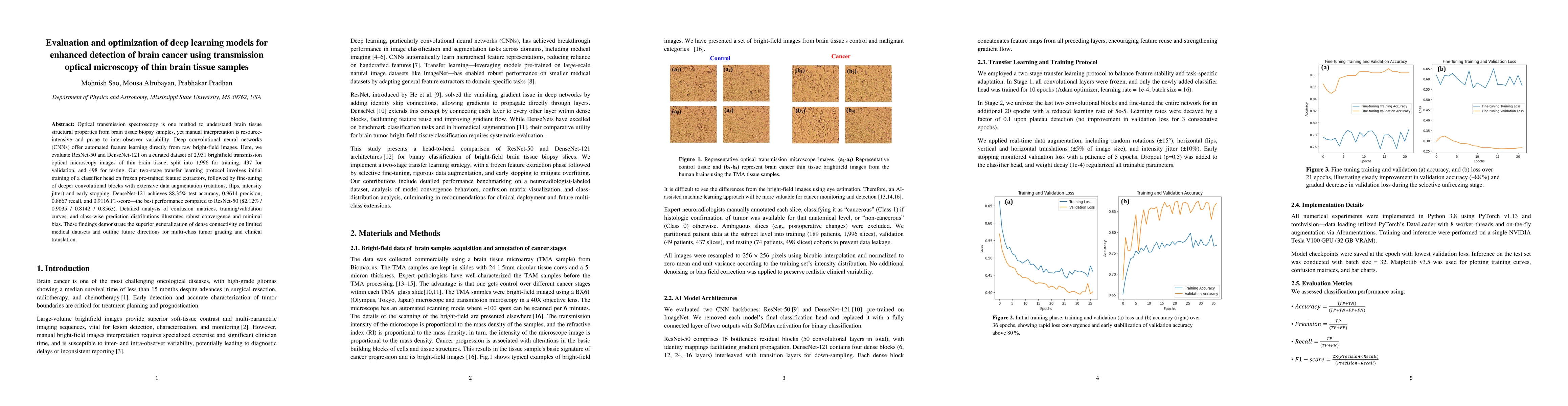 Optical transmission spectroscopy is one method to understand brain tissue structural properties from brain tissue biopsy samples, yet manual interpretation is resource intensive and prone to inter observer variability. Deep convolutional neural networks (CNNs) offer automated feature learning directly from raw brightfield images. Here, we evaluate ResNet50 and DenseNet121 on a curated dataset of 2,931 bright-field transmission optical microscopy images of thin brain tissue, split into 1,996 for training, 437 for validation, and 498 for testing. Our two stage transfer learning protocol involves initial training of a classifier head on frozen pretrained feature extractors, followed by fine tuning of deeper convolutional blocks with extensive data augmentation (rotations, flips, intensity jitter) and early stopping. DenseNet121 achieves 88.35 percent test accuracy, 0.9614 precision, 0.8667 recall, and 0.9116 F1 score the best performance compared to ResNet50 (82.12 percent, 0.9035, 0.8142, 0.8563). Detailed analysis of confusion matrices, training and validation curves, and classwise prediction distributions illustrates robust convergence and minimal bias. These findings demonstrate the superior generalization of dense connectivity on limited medical datasets and outline future directions for multi-class tumor grading and clinical translation.