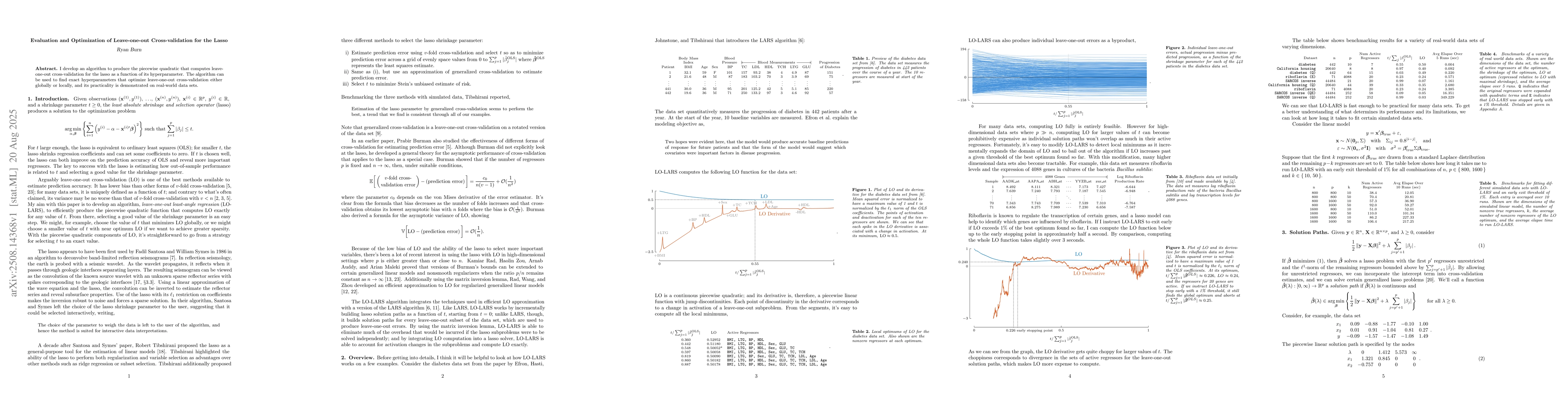 The paper develops an algorithm to compute the piecewise quadratic function for leave-one-out cross-validation (LOO CV) of the Lasso model as a function of its hyperparameter. This algorithm can find both global and local optimal hyperparameters for LOO CV.