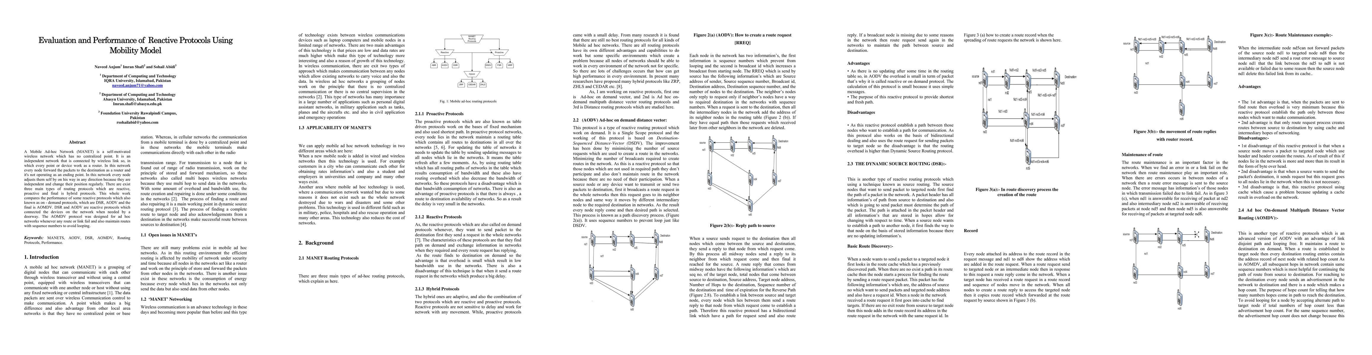 This paper evaluates the performance of three reactive routing protocols—DSR, AODV, and AOMDV—in Mobile Ad-hoc Networks (MANETs) using mobility models to simulate node movement. The study compares how these protocols handle route discovery and maintenance under varying network conditions.