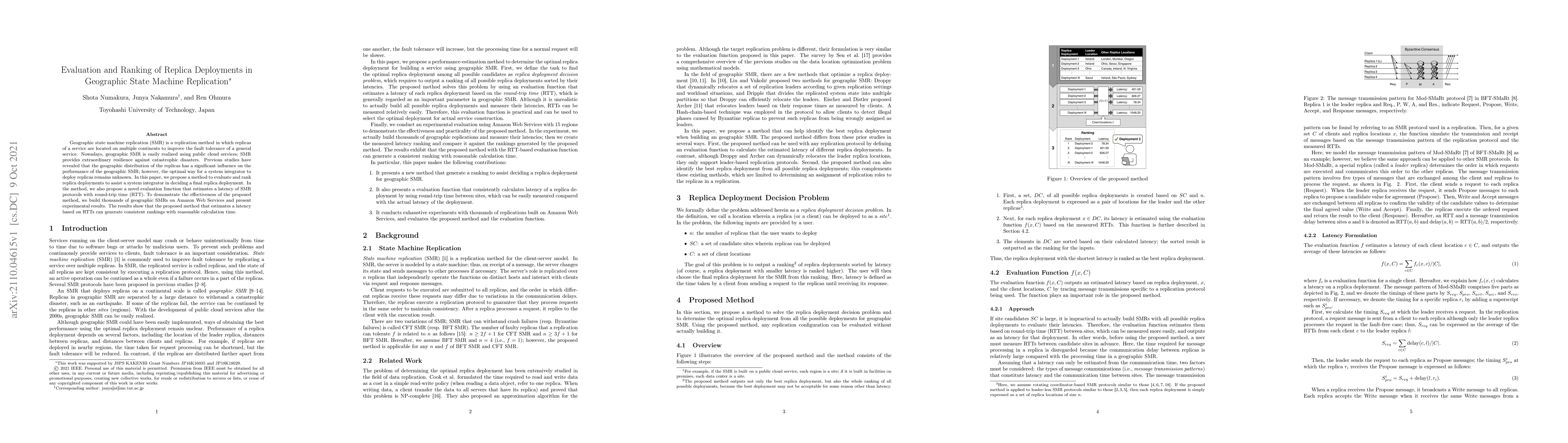 Geographic state machine replication (SMR) is a replication method in which replicas of a service are located on multiple continents to improve the fault tolerance of a general service. Nowadays, geographic SMR is easily realized using public cloud services; SMR provides extraordinary resilience against catastrophic disasters. Previous studies have revealed that the geographic distribution of the replicas has a significant influence on the performance of the geographic SMR; however, the optimal way for a system integrator to deploy replicas remains unknown. In this paper, we propose a method to evaluate and rank replica deployments to assist a system integrator in deciding a final replica deployment. In the method, we also propose a novel evaluation function that estimates a latency of SMR protocols with round-trip time (RTT). To demonstrate the effectiveness of the proposed method, we build thousands of geographic SMRs on Amazon Web Services and present experimental results. The results show that the proposed method that estimates a latency based on RTTs can generate consistent rankings with reasonable calculation time.