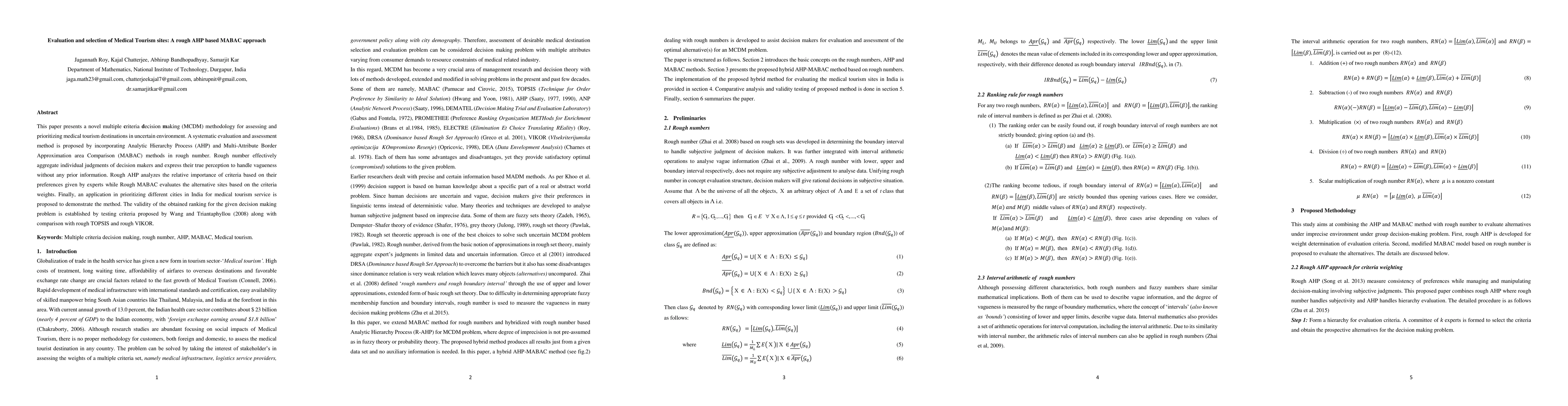 In this paper, a novel multiple criteria decision making (MCDM) methodology is presented for assessing and prioritizing medical tourism destinations in uncertain environment. A systematic evaluation and assessment method is proposed by integrating rough number based AHP (Analytic Hierarchy Process) and rough number based MABAC (Multi-Attributive Border Approximation area Comparison). Rough number is used to aggregate individual judgments and preferences to deal with vagueness in decision making due to limited data. Rough AHP analyzes the relative importance of criteria based on their preferences given by experts. Rough MABAC evaluates the alternative sites based on the criteria weights. The proposed methodology is explained through a case study considering different cities for healthcare service in India. The validity of the obtained ranking for the given decision making problem is established by testing criteria proposed by Wang and Triantaphyllou (2008) along with further analysis and discussion.