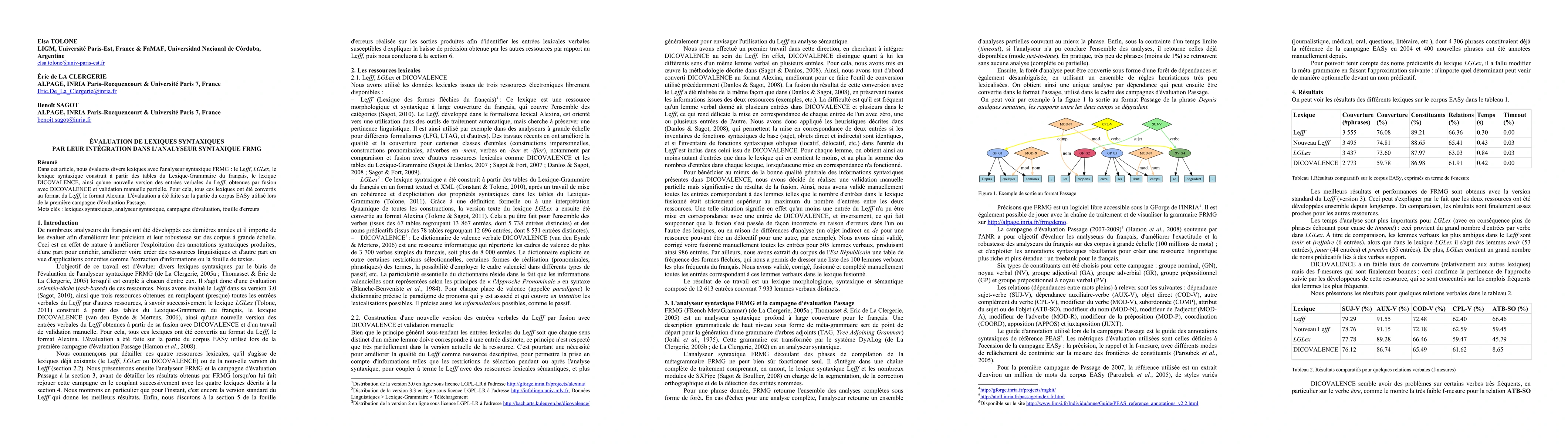 In this paper, we evaluate various French lexica with the parser FRMG: the Lefff, LGLex, the lexicon built from the tables of the French Lexicon-Grammar, the lexicon DICOVALENCE and a new version of the verbal entries of the Lefff, obtained by merging with DICOVALENCE and partial manual validation. For this, all these lexica have been converted to the format of the Lefff, Alexina format. The evaluation was made on the part of the EASy corpus used in the first evaluation campaign Passage.