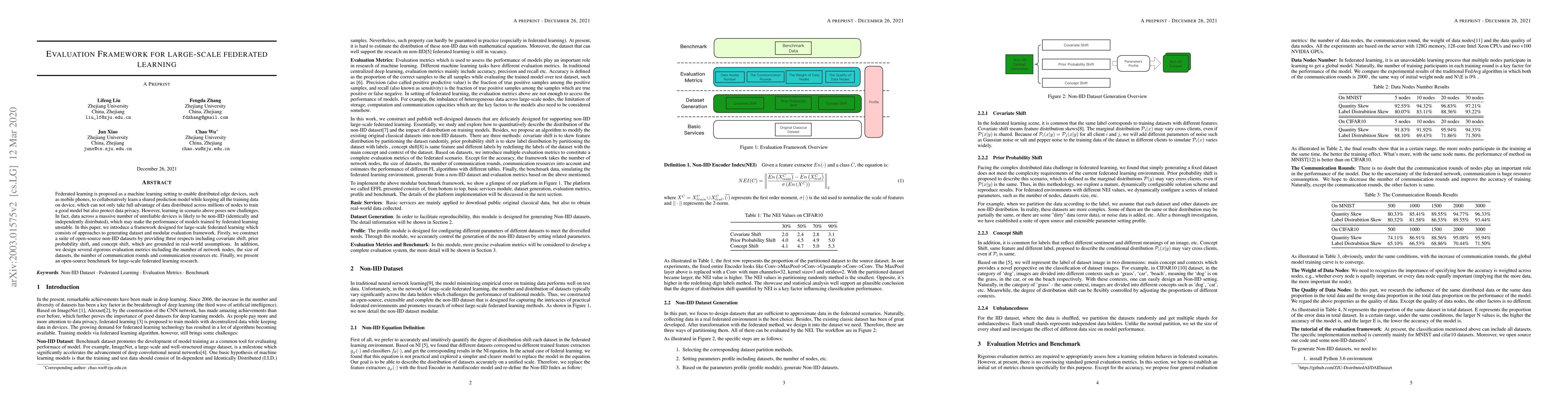 Federated learning is proposed as a machine learning setting to enable distributed edge devices, such as mobile phones, to collaboratively learn a shared prediction model while keeping all the training data on device, which can not only take full advantage of data distributed across millions of nodes to train a good model but also protect data privacy. However, learning in scenario above poses new challenges. In fact, data across a massive number of unreliable devices is likely to be non-IID (identically and independently distributed), which may make the performance of models trained by federated learning unstable. In this paper, we introduce a framework designed for large-scale federated learning which consists of approaches to generating dataset and modular evaluation framework. Firstly, we construct a suite of open-source non-IID datasets by providing three respects including covariate shift, prior probability shift, and concept shift, which are grounded in real-world assumptions. In addition, we design several rigorous evaluation metrics including the number of network nodes, the size of datasets, the number of communication rounds and communication resources etc. Finally, we present an open-source benchmark for large-scale federated learning research.
