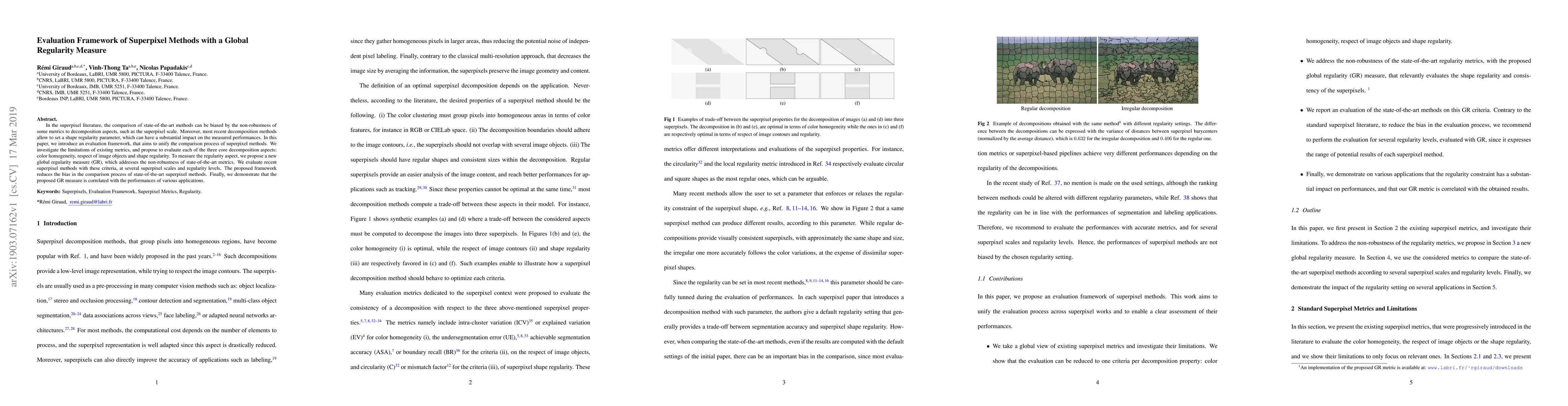 This paper introduces an evaluation framework to compare superpixel methods, addressing the bias in existing metrics due to non-robustness to decomposition aspects. It proposes a new global regularity measure (GR) to assess shape regularity, and evaluates recent methods across different scales and regularity levels, demonstrating reduced bias in comparisons and correlation with application performance.