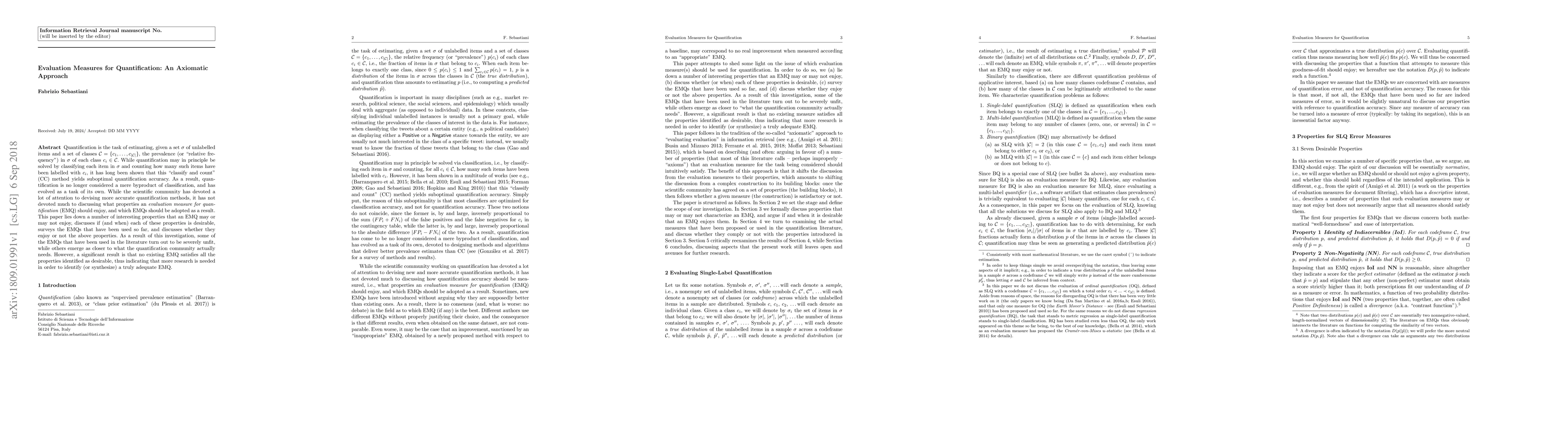 This paper investigates evaluation measures for quantification, a task that estimates class prevalence in unlabelled items, and finds no existing measure satisfies all desirable properties, highlighting the need for further research.