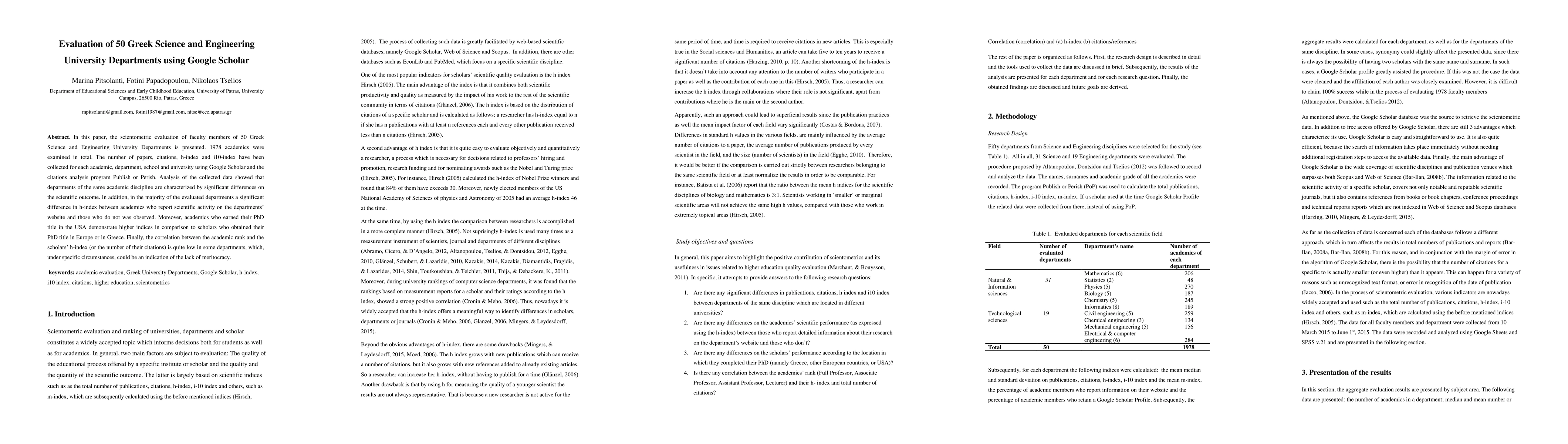 This study evaluates 50 Greek Science and Engineering university departments using Google Scholar data, revealing significant differences in scientific output among departments and academics. Notably, PhDs from the USA correlate with higher academic indices, while the correlation between rank and h-index suggests potential issues with meritocracy in some departments.