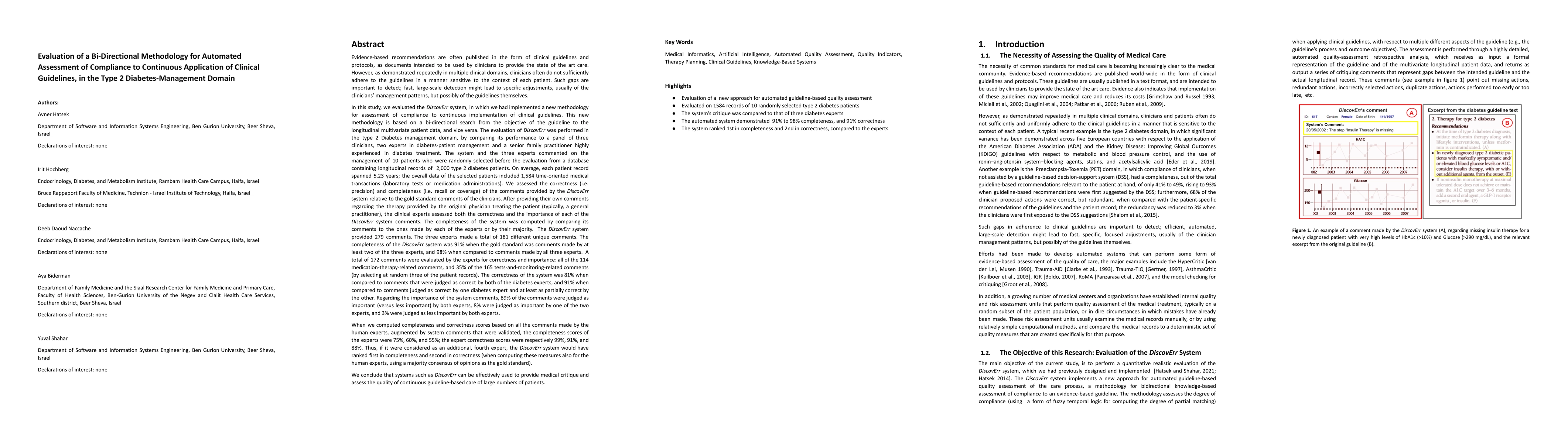 We evaluated the DiscovErr system, in which we had previously implemented a new methodology for assessment of compliance to continuous application of evidence-based clinical guidelines, based on a bidirectional search from the guideline objectives to the patient's longitudinal data, and vice versa. We compared the system comments on 1584 transactions regarding the management, over a mean of 5.23 years, of 10 randomly selected Type 2 diabetes patients, to those of two diabetes experts and a senior family practitioner. After providing their own comments, the experts assessed both the correctness (precision) and the importance of each of the DiscovErr system comments. The completeness (recall or coverage) of the system was computed by comparing its comments to those made by the experts. The system made 279 comments. The experts made 181 unique comments. The completeness of the system was 91% compared to comments made by at least two experts, and 98% when compared to comments made by all three. 172 comments were evaluated by the experts for correctness and importance: All 114 medication-related comments, and a random 35% of the 165 monitoring-related comments. The system's correctness was 81% compared to comments judged as correct by both diabetes experts, and 91% compared to comments judged as correct by a diabetes expert and at least as partially correct by the other. 89% of the comments were judged as important by both diabetes experts, 8% were judged as important by one expert, 3% were judged as less important by both experts. The completeness scores of the three experts (compared to the comments of all experts plus the validated system comments) were 75%, 60%, and 55%; the experts' correctness scores (compared to their majority) were respectively 99%, 91%, and 88%. Conclusion: Systems such as DiscovErr can assess the quality of continuous guideline-based care.
