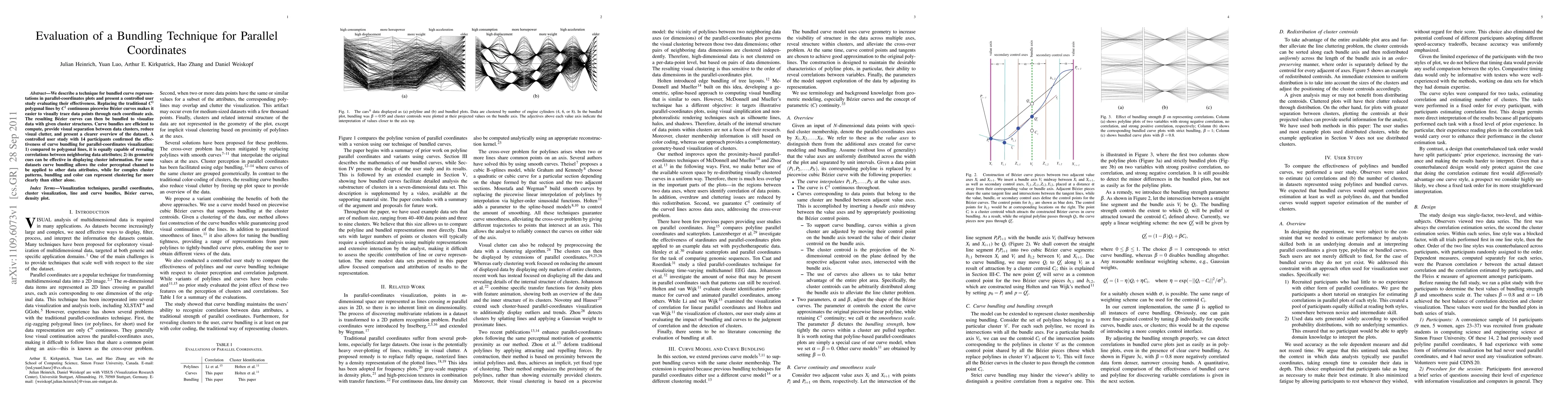 We describe a technique for bundled curve representations in parallel-coordinates plots and present a controlled user study evaluating their effectiveness. Replacing the traditional C^0 polygonal lines by C^1 continuous piecewise Bezier curves makes it easier to visually trace data points through each coordinate axis. The resulting Bezier curves can then be bundled to visualize data with given cluster structures. Curve bundles are efficient to compute, provide visual separation between data clusters, reduce visual clutter, and present a clearer overview of the dataset. A controlled user study with 14 participants confirmed the effectiveness of curve bundling for parallel-coordinates visualization: 1) compared to polygonal lines, it is equally capable of revealing correlations between neighboring data attributes; 2) its geometric cues can be effective in displaying cluster information. For some datasets curve bundling allows the color perceptual channel to be applied to other data attributes, while for complex cluster patterns, bundling and color can represent clustering far more clearly than either alone.