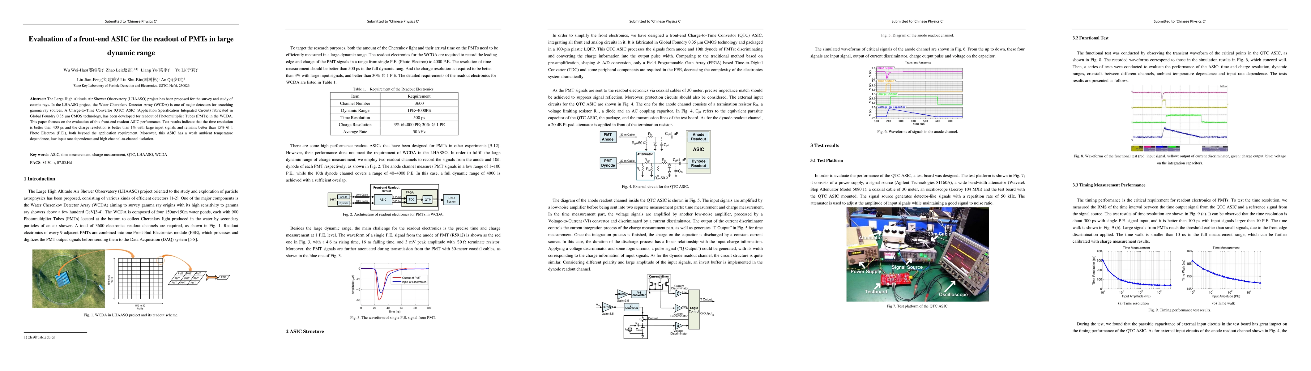 This paper evaluates a front-end ASIC for reading Photomultiplier Tubes in the LHAASO project's Water Cherenkov Detector Array, demonstrating time resolution below 400 ps and charge resolution better than 1% for large signals, surpassing application requirements.