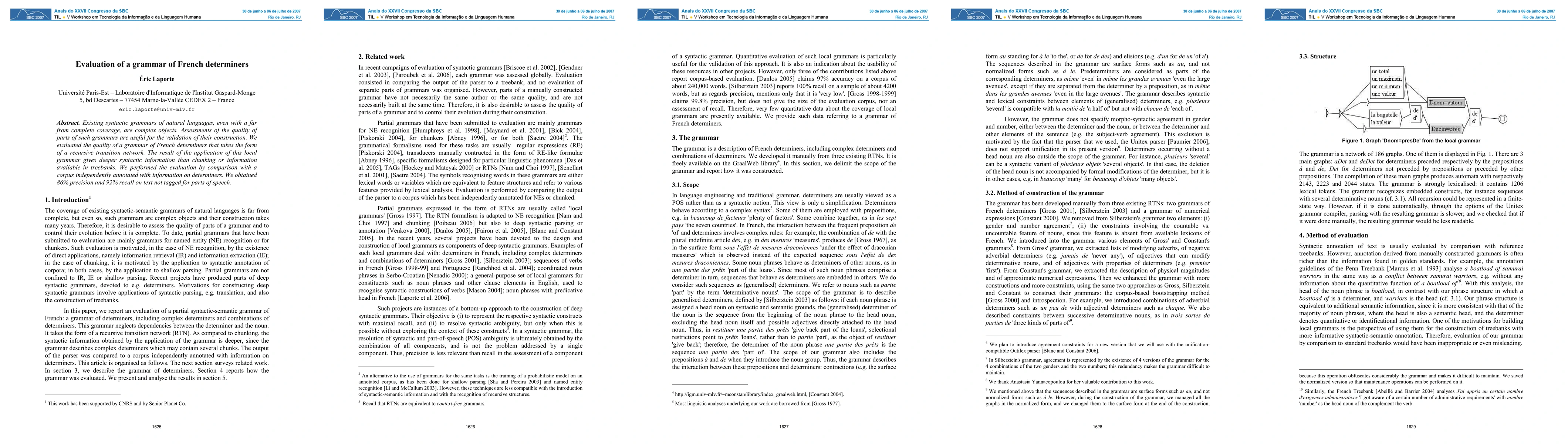 Existing syntactic grammars of natural languages, even with a far from complete coverage, are complex objects. Assessments of the quality of parts of such grammars are useful for the validation of their construction. We evaluated the quality of a grammar of French determiners that takes the form of a recursive transition network. The result of the application of this local grammar gives deeper syntactic information than chunking or information available in treebanks. We performed the evaluation by comparison with a corpus independently annotated with information on determiners. We obtained 86% precision and 92% recall on text not tagged for parts of speech.