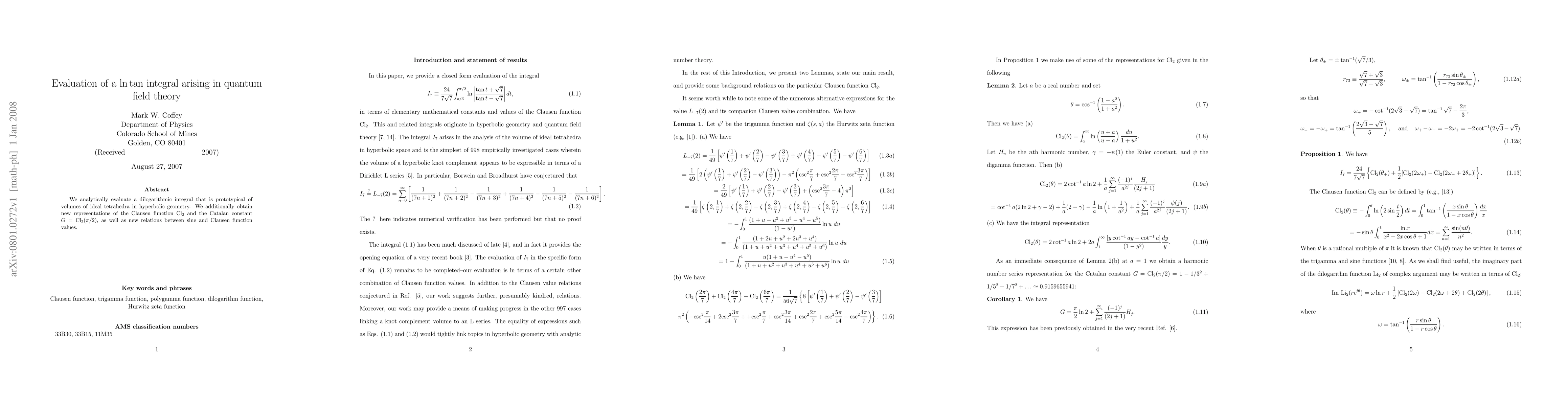 This paper presents an analytical evaluation of a complex integral crucial in quantum field theory, also linking to hyperbolic geometry. It unveils fresh representations of the Clausen function and Catalan constant, along with new sine-Clausen relations.