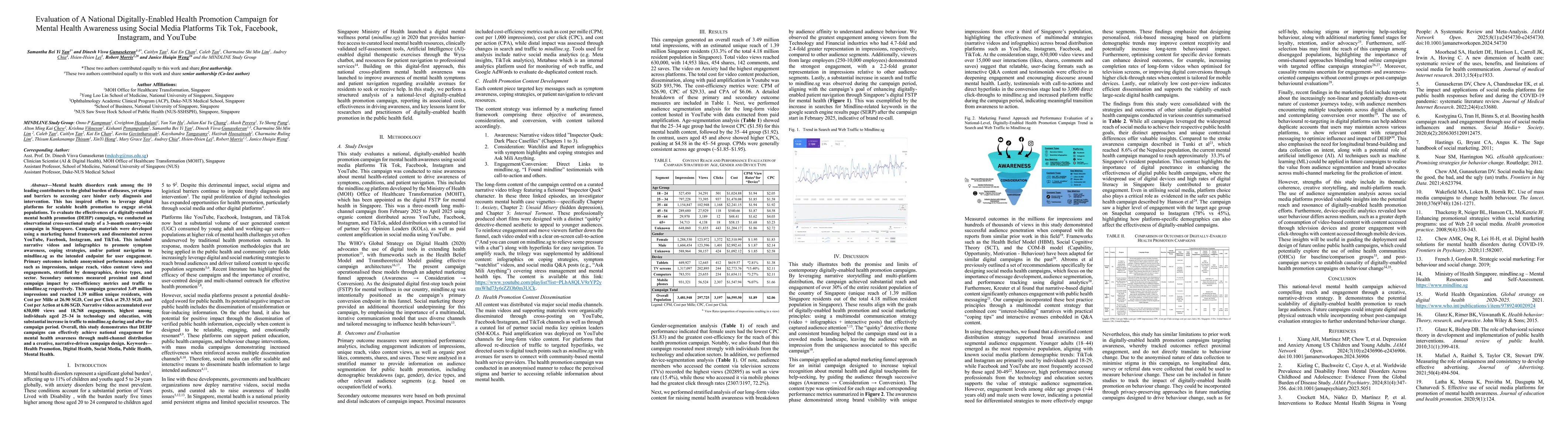Mental health disorders rank among the 10 leading contributors to the global burden of diseases, yet persistent stigma and care barriers delay early intervention. This has inspired efforts to leverage digital platforms for scalable health promotion to engage at-risk populations. To evaluate the effectiveness of a digitally-enabled mental health promotion (DEHP) campaign, we conducted an observational cross-sectional study of a 3-month (February-April 2025) nation-wide campaign in Singapore. Campaign materials were developed using a marketing funnel framework and disseminated across YouTube, Facebook, Instagram, and TikTok. This included narrative videos and infographics to promote symptom awareness, coping strategies, and/or patient navigation to Singapore's Mindline website, as the intended endpoint for user engagement and support. Primary outcomes include anonymised performance analytics (impressions, unique reach, video content view, engagements) stratified by demographics, device types, and sector. Secondary outcomes measured cost-efficiency metrics and traffic to the Mindline website respectively. This campaign generated 3.49 million total impressions and reached 1.39 million unique residents, with a Cost per Mille at $26.90, Cost per Click at $29.33, and Cost per Action at $6.06. Narrative videos accumulated over 630,000 views and 18,768 engagements. Overall, we demonstrate that DEHP campaigns can achieve national engagement for mental health awareness through multi-channel distribution and creative, narrative-driven designs.