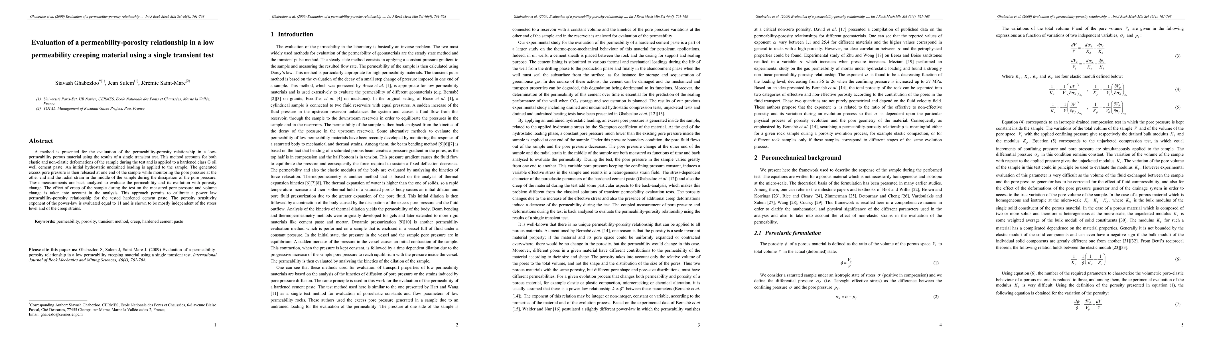 This paper evaluates the permeability-porosity relationship in low-permeability oil well cement paste using a single transient test, accounting for elastic and non-elastic deformations. The method calibrates a power law relationship with a porosity sensitivity exponent of 11, independent of stress and creep strains.