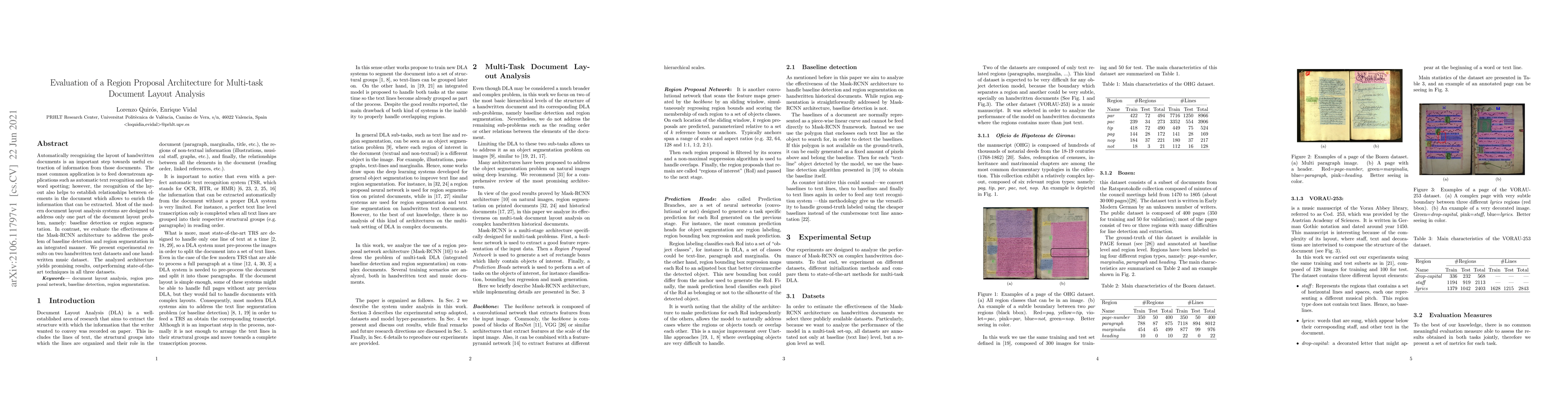 This research evaluates the Mask-RCNN architecture for integrated baseline detection and region segmentation in multi-task document layout analysis. Experimental results on handwritten text and music datasets show superior performance compared to state-of-the-art techniques.