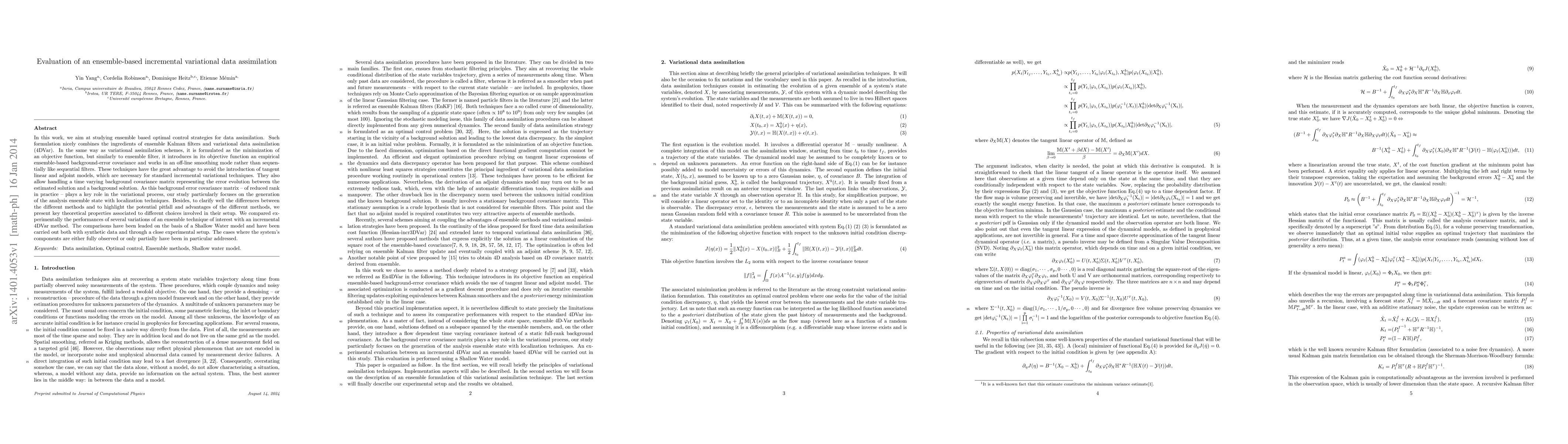 This paper evaluates an ensemble-based incremental variational data assimilation method that combines ensemble Kalman filters and variational data assimilation. The method avoids tangent linear and adjoint models, handles time-varying background covariance matrices, and focuses on generating an analysis ensemble state with localization techniques. Experimental results comparing the method with incremental 4DVar on a Shallow Water model show its performance under fully and partially observed conditions.