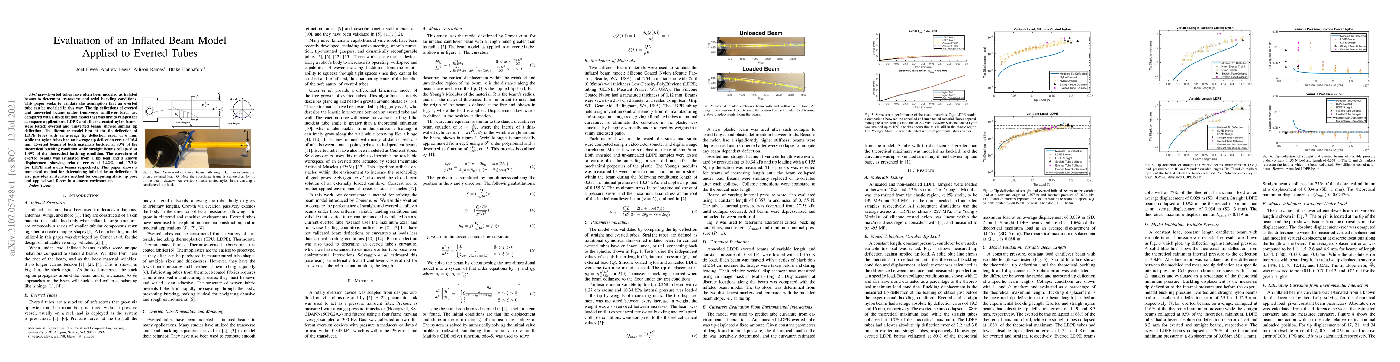 Everted tubes have often been modeled as inflated beams to determine transverse and axial buckling conditions. This paper seeks to validate the assumption that an everted tube can be modeled in this way. The tip deflections of everted and uneverted beams under transverse cantilever loads are compared with a tip deflection model that was first developed for aerospace applications. LDPE and silicone coated nylon beams were tested; everted and uneverted beams showed similar tip deflection. The literature model best fit the tip deflection of LDPE tubes with an average tip deflection error of 6 mm, while the nylon tubes had an average tip deflection error of 16.4 mm. Everted beams of both materials buckled at 83% of the theoretical buckling condition while straight beams collapsed at 109% of the theoretical buckling condition. The curvature of everted beams was estimated from a tip load and a known displacement showing relative errors of 14.2% and 17.3% for LDPE and nylon beams respectively. This paper shows a numerical method for determining inflated beam deflection. It also provides an iterative method for computing static tip pose and applied wall forces in a known environment.