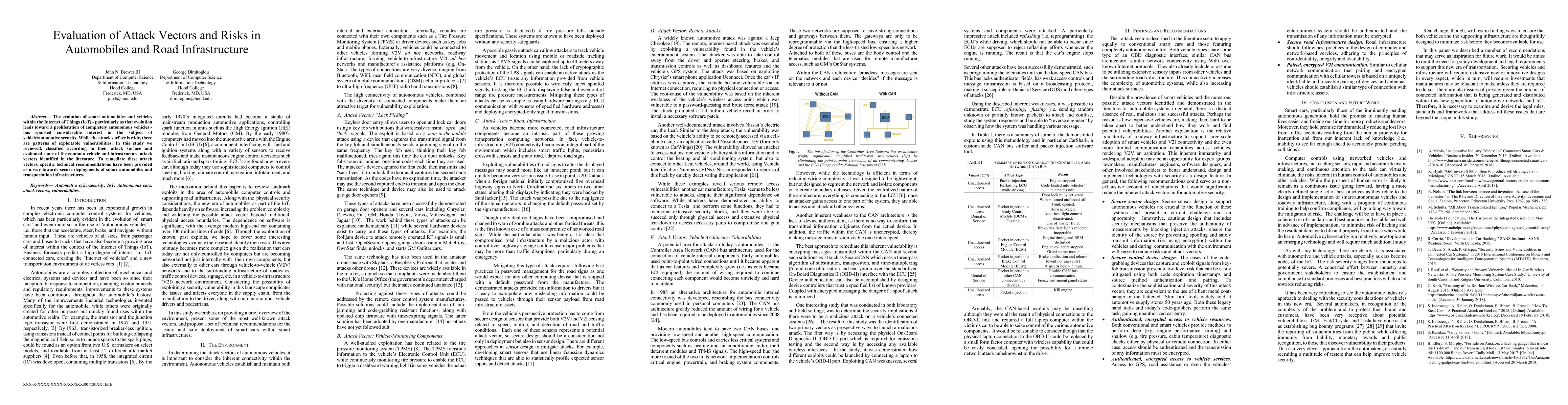 This research evaluates common attack vectors and risks in smart automobiles and road infrastructure, classifying them based on their attack surface. It provides technical recommendations for securing deployments of autonomous vehicles and related infrastructure.