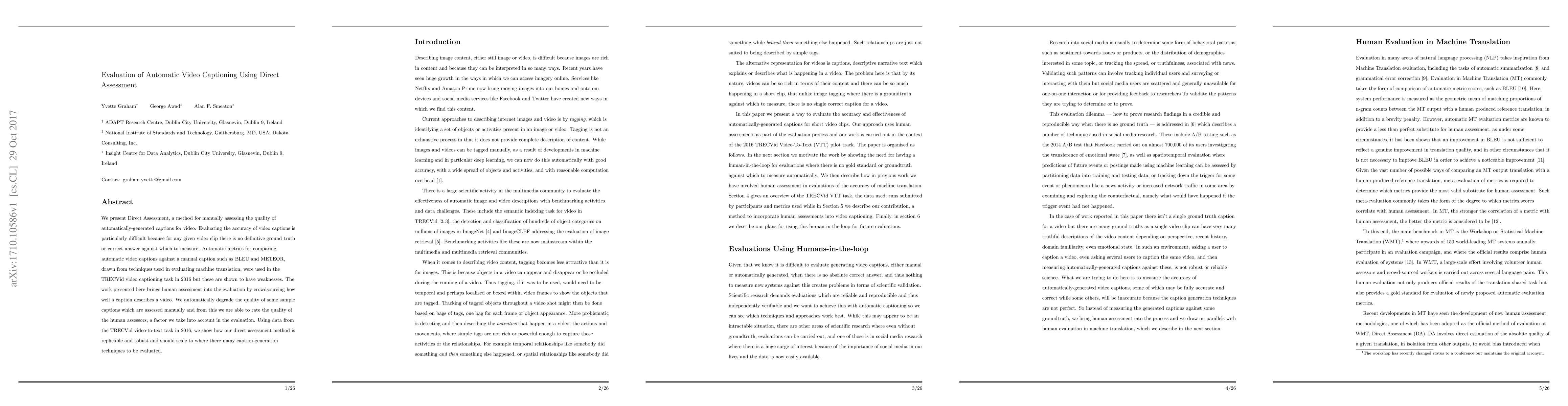 This paper introduces Direct Assessment, a human-centered evaluation method for automatic video captioning, addressing the lack of definitive ground truth. It combines automatic metrics with crowdsourced human assessments to improve the evaluation of video captions, demonstrating its replicability and robustness using data from the TRECVid 2016 task.