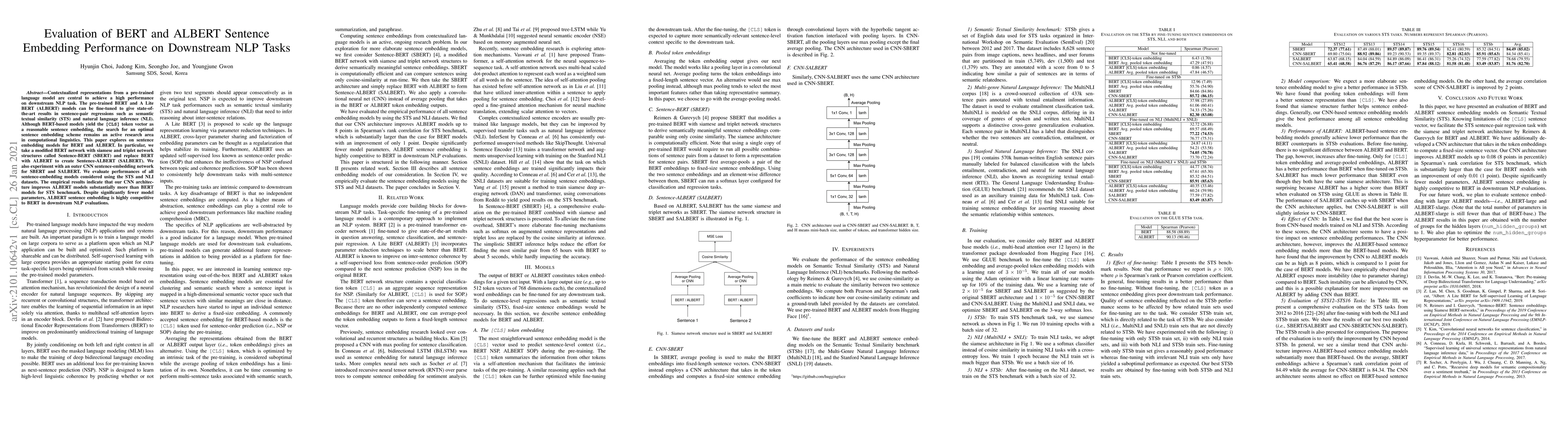 This paper evaluates various sentence embedding models, including BERT, ALBERT, Sentence-BERT (SBERT), and Sentence-ALBERT (SALBERT), on semantic textual similarity (STS) and natural language inference (NLI) tasks. The study finds that while CNN-enhanced ALBERT models outperform BERT models on the STS benchmark, ALBERT remains competitive with BERT despite having fewer parameters.