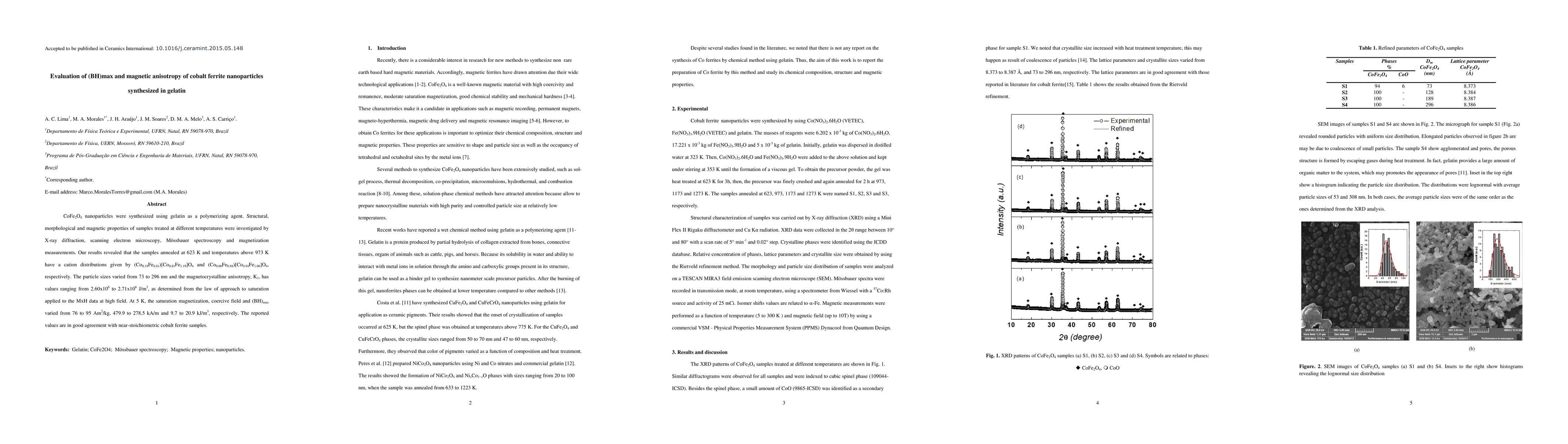 This study investigates CoFe2O4 nanoparticles synthesized with gelatin, revealing structural and magnetic properties via various techniques. The samples show varying cation distributions and particle sizes, with magnetocrystalline anisotropy values ranging from 2.60x10^6 to 2.71x10^6 J/m3, and (BH)max values from 9.7 to 20.9 kJ/m3 at 5 K.