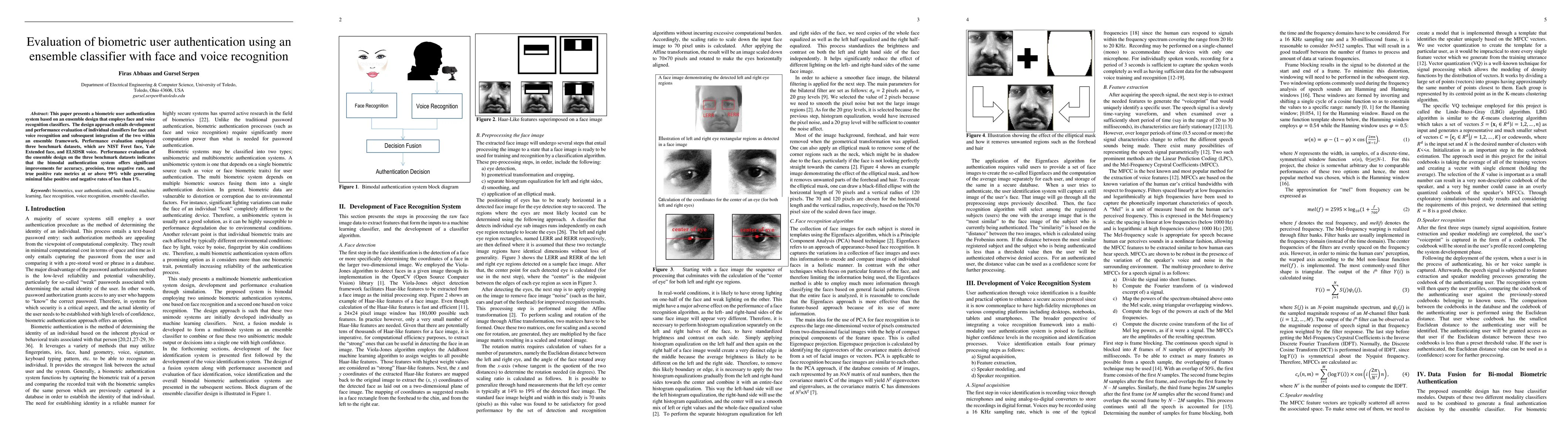 This paper evaluates a biometric authentication system using an ensemble classifier combining face and voice recognition, showing significant improvements in accuracy and precision above 99% with minimal false positive and negative rates.