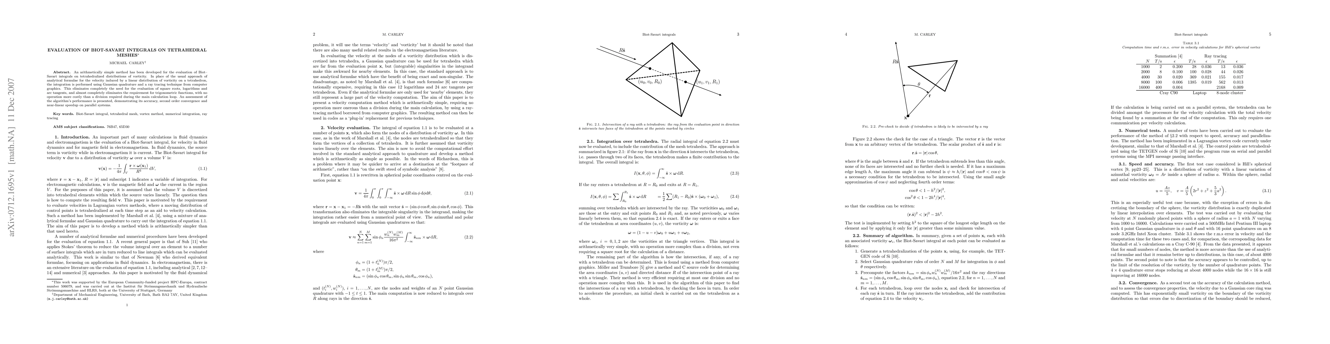 This paper presents a novel method for evaluating Biot-Savart integrals on tetrahedral meshes using Gaussian quadrature and ray tracing, significantly reducing computational costs by avoiding expensive operations like square roots and trigonometric functions. The algorithm demonstrates high accuracy, second-order convergence, and near-linear speedup on parallel systems.