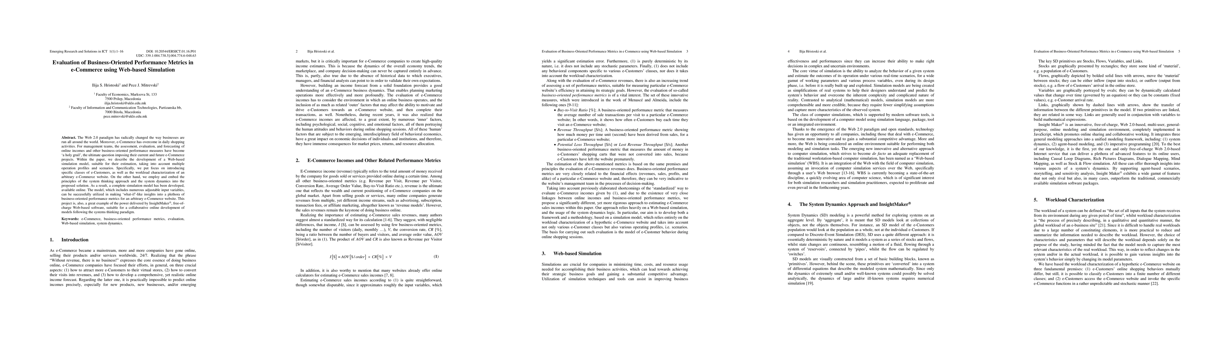 A Web-based simulation model was developed to evaluate business-oriented performance metrics in e-commerce, using system thinking and dynamics principles. The model provides 'what-if' insights into various business metrics for arbitrary e-commerce websites.