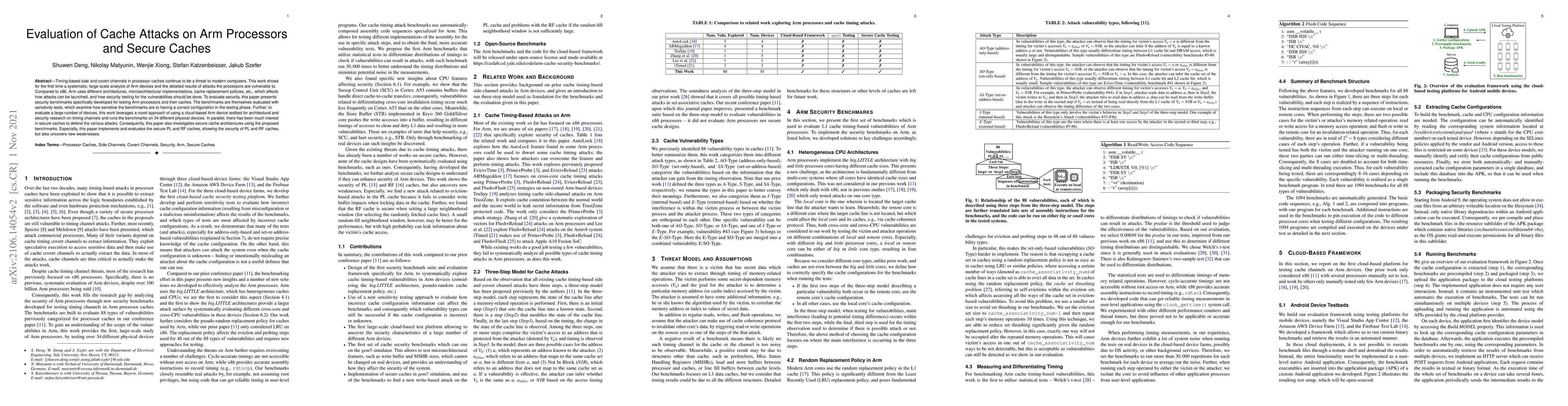 Timing-based side and covert channels in processor caches continue to be a threat to modern computers. This work shows for the first time a systematic, large-scale analysis of Arm devices and the detailed results of attacks the processors are vulnerable to. Compared to x86, Arm uses different architectures, microarchitectural implementations, cache replacement policies, etc., which affects how attacks can be launched, and how security testing for the vulnerabilities should be done. To evaluate security, this paper presents security benchmarks specifically developed for testing Arm processors and their caches. The benchmarks are themselves evaluated with sensitivity tests, which examine how sensitive the benchmarks are to having a correct configuration in the testing phase. Further, to evaluate a large number of devices, this work leverages a novel approach of using a cloud-based Arm device testbed for architectural and security research on timing channels and runs the benchmarks on 34 different physical devices. In parallel, there has been much interest in secure caches to defend the various attacks. Consequently, this paper also investigates secure cache architectures using the proposed benchmarks. Especially, this paper implements and evaluates the secure PL and RF caches, showing the security of PL and RF caches, but also uncovers new weaknesses.