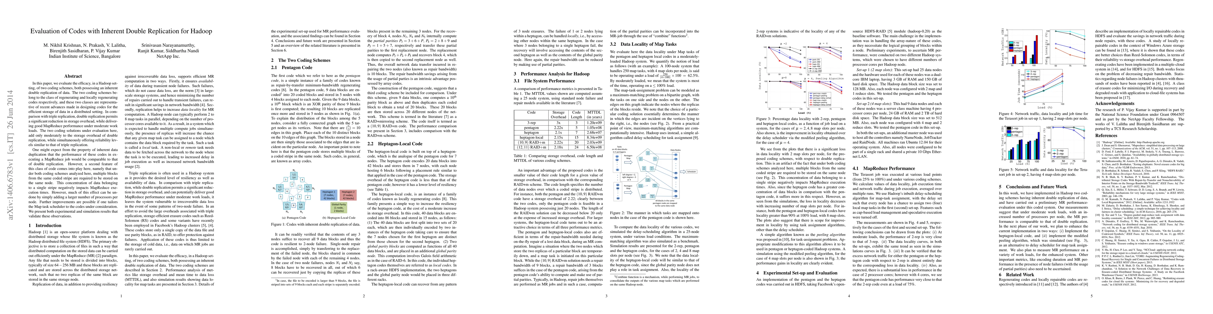In this paper, we evaluate the efficacy, in a Hadoop setting, of two coding schemes, both possessing an inherent double replication of data. The two coding schemes belong to the class of regenerating and locally regenerating codes respectively, and these two classes are representative of recent advances made in designing codes for the efficient storage of data in a distributed setting. In comparison with triple replication, double replication permits a significant reduction in storage overhead, while delivering good MapReduce performance under moderate work loads. The two coding solutions under evaluation here, add only moderately to the storage overhead of double replication, while simultaneously offering reliability levels similar to that of triple replication. One might expect from the property of inherent data duplication that the performance of these codes in executing a MapReduce job would be comparable to that of double replication. However, a second feature of this class of code comes into play here, namely that under both coding schemes analyzed here, multiple blocks from the same coded stripe are required to be stored on the same node. This concentration of data belonging to a single stripe negatively impacts MapReduce execution times. However, much of this effect can be undone by simply adding a larger number of processors per node. Further improvements are possible if one tailors the Map task scheduler to the codes under consideration. We present both experimental and simulation results that validate these observations.