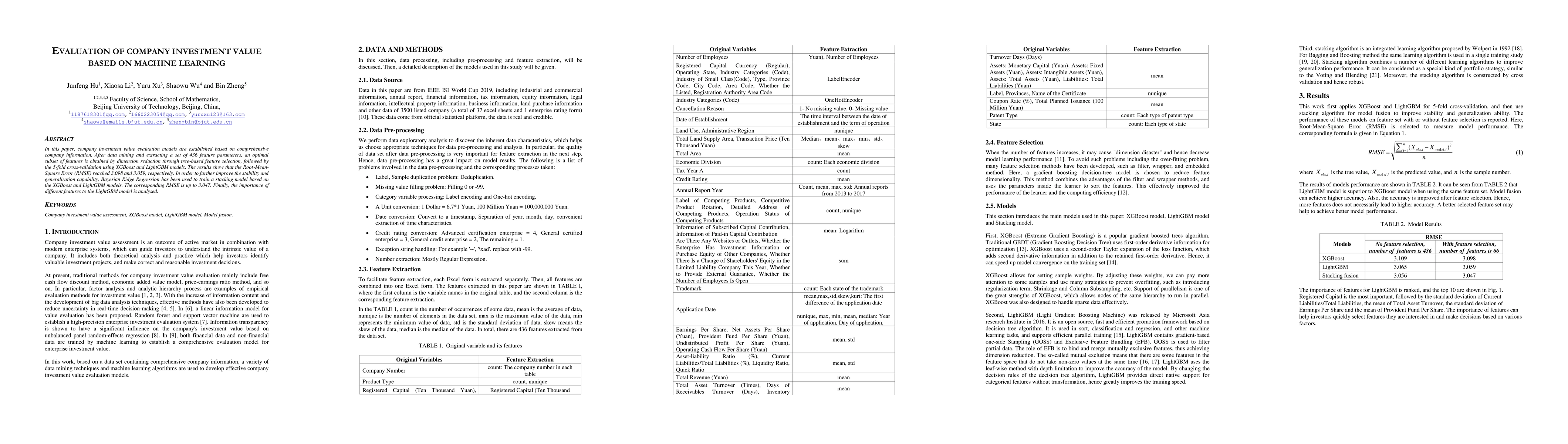 In this paper, company investment value evaluation models are established based on comprehensive company information. After data mining and extracting a set of 436 feature parameters, an optimal subset of features is obtained by dimension reduction through tree-based feature selection, followed by the 5-fold cross-validation using XGBoost and LightGBM models. The results show that the Root-Mean-Square Error (RMSE) reached 3.098 and 3.059, respectively. In order to further improve the stability and generalization capability, Bayesian Ridge Regression has been used to train a stacking model based on the XGBoost and LightGBM models. The corresponding RMSE is up to 3.047. Finally, the importance of different features to the LightGBM model is analysed.