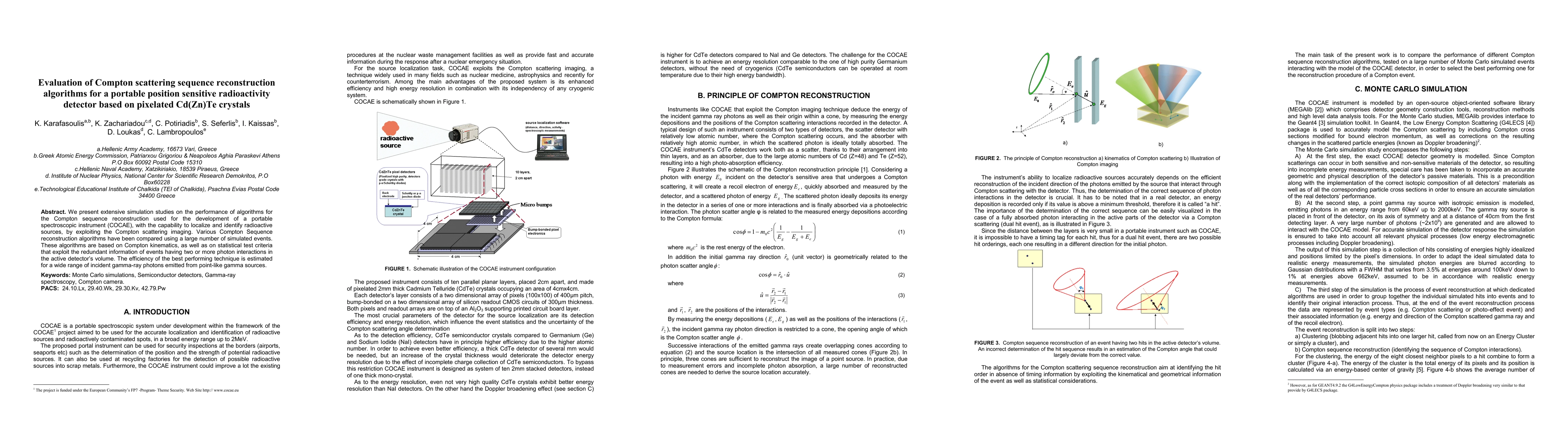 We present extensive simulation studies on the performance of algorithms for the Compton sequence reconstruction used for the development of a portable spectroscopic instrument (COCAE), with the capability to localize and identify radioactive sources, by exploiting the Compton scattering imaging. Various Compton Sequence reconstruction algorithms have been compared using a large number of simulated events. These algorithms are based on Compton kinematics, as well as on statistical test criteria that exploit the redundant information of events having two or more photon interactions in the active detector's volume. The efficiency of the best performing technique is estimated for a wide range of incident gamma-ray photons emitted from point-like gamma sources.