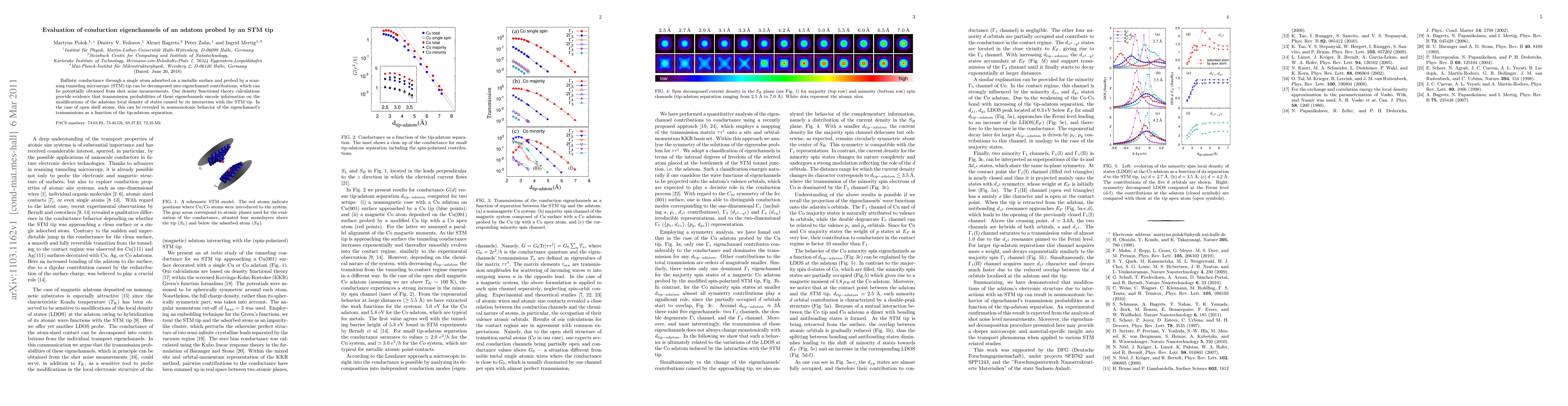 Ballistic conductance through a single atom adsorbed on a metallic surface and probed by a scanning tunneling microscope (STM) tip can be decomposed into eigenchannel contributions, which can be potentially obtained from shot noise measurements. Our density functional theory calculations provide evidence that transmission probabilities of these eigenchannels encode information on the modifications of the adatom's local density of states caused by its interaction with the STM tip. In the case of open shell atoms, this can be revealed in nonmonotonic behavior of the eigenchannel's transmissions as a function of the tip-adatom separation.