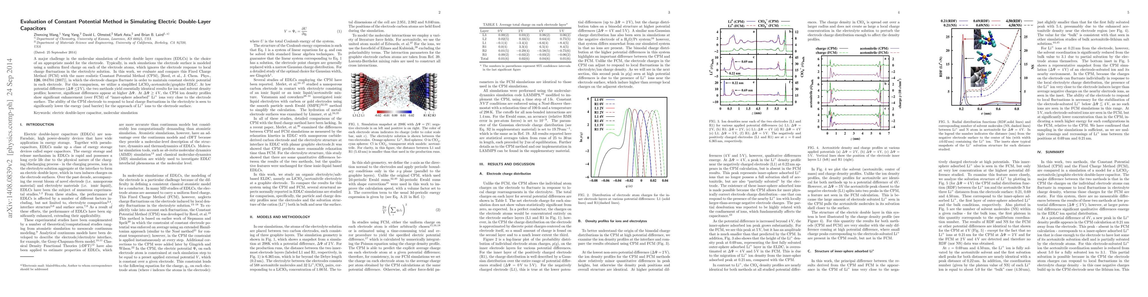 A major challenge in the molecular simulation of electric double layer capacitors (EDLCs) is the choice of an appropriate model for the electrode. Typically, in such simulations the electrode surface is modeled using a uniform fixed charge on each of the electrode atoms, which ignores the electrode response to local charge fluctuations induced by charge fluctuations in the electrolyte. In this work, we evaluate and compare this Fixed Charge Method (FCM) with the more realistic Constant Potential Method (CPM), [Reed, et al., J. Chem. Phys., 126, 084704 (2007)], in which the electrode charges fluctuate in order to maintain constant electric potential in each electrode. For this comparison, we utilize a simplified LiClO$_4$-acetonitrile/graphite EDLC. At low potential difference ($\Delta\Psi\le 2V$), the two methods yield essentially identical results for ion and solvent density profiles; however, significant differences appear at higher $\Delta\Psi$. At $\Delta\Psi\ge 4V$, the CPM ion density profiles show significant enhancement (over FCM) of "partially electrode solvated" Li$^+$ ions very close to the electrode surface. The ability of the CPM electrode to respond to local charge fluctuations in the electrolyte is seen to significantly lower the energy (and barrier) for the approach of Li$^+$ ions to the electrode surface.