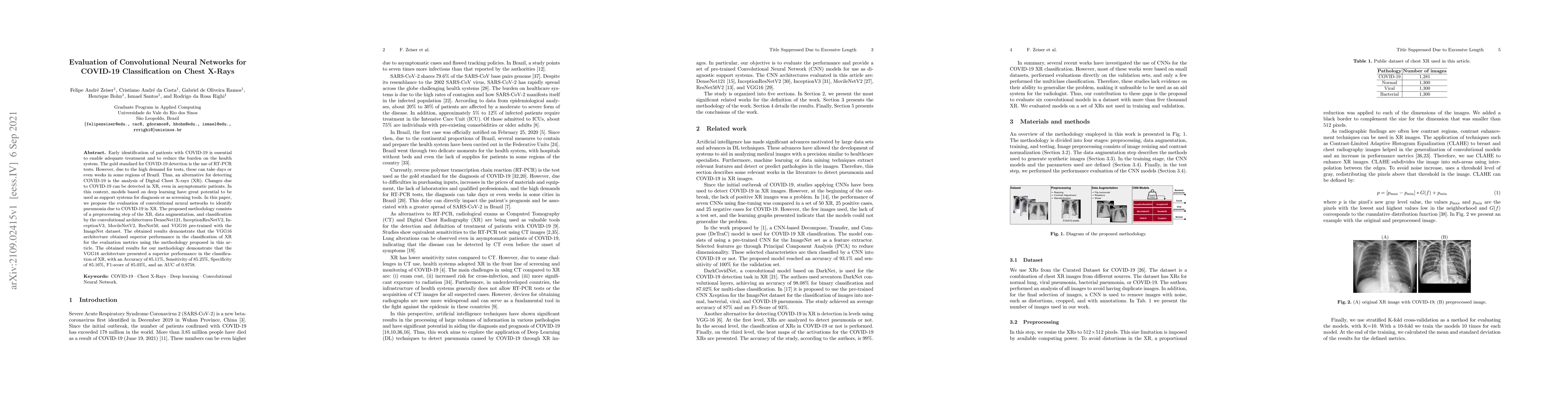 Early identification of patients with COVID-19 is essential to enable adequate treatment and to reduce the burden on the health system. The gold standard for COVID-19 detection is the use of RT-PCR tests. However, due to the high demand for tests, these can take days or even weeks in some regions of Brazil. Thus, an alternative for detecting COVID-19 is the analysis of Digital Chest X-rays (XR). Changes due to COVID-19 can be detected in XR, even in asymptomatic patients. In this context, models based on deep learning have great potential to be used as support systems for diagnosis or as screening tools. In this paper, we propose the evaluation of convolutional neural networks to identify pneumonia due to COVID-19 in XR. The proposed methodology consists of a preprocessing step of the XR, data augmentation, and classification by the convolutional architectures DenseNet121, InceptionResNetV2, InceptionV3, MovileNetV2, ResNet50, and VGG16 pre-trained with the ImageNet dataset. The obtained results demonstrate that the VGG16 architecture obtained superior performance in the classification of XR for the evaluation metrics using the methodology proposed in this article. The obtained results for our methodology demonstrate that the VGG16 architecture presented a superior performance in the classification of XR, with an Accuracy of 85.11%, Sensitivity of 85.25%, Specificity of $85.16%, F1-score of $85.03%, and an AUC of 0.9758.