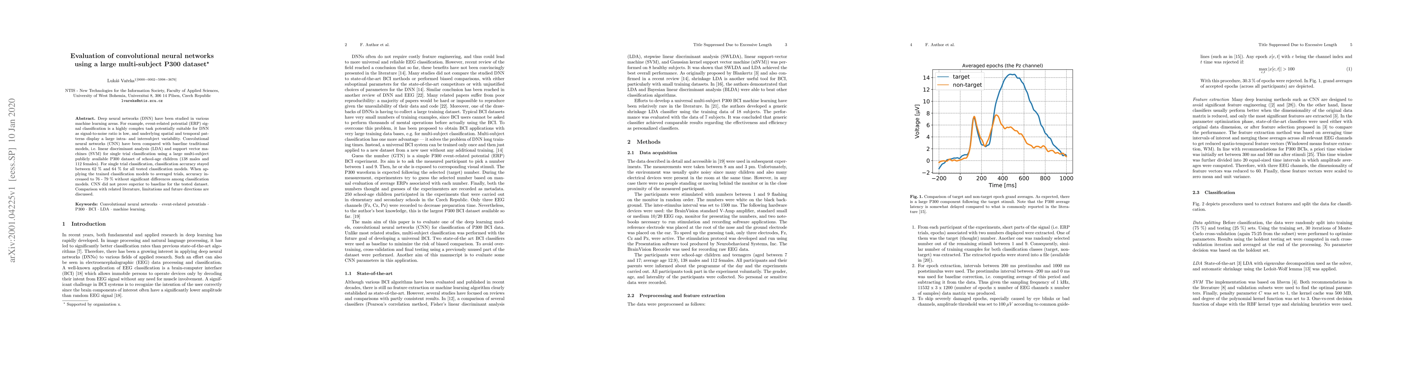Deep neural networks (DNN) have been studied in various machine learning areas. For example, event-related potential (ERP) signal classification is a highly complex task potentially suitable for DNN as signal-to-noise ratio is low, and underlying spatial and temporal patterns display a large intra- and intersubject variability. Convolutional neural networks (CNN) have been compared with baseline traditional models, i.e. linear discriminant analysis (LDA) and support vector machines (SVM) for single trial classification using a large multi-subject publicly available P300 dataset of school-age children (138 males and 112 females). For single trial classification, classification accuracy stayed between 62% and 64% for all tested classification models. When applying the trained classification models to averaged trials, accuracy increased to 76-79% without significant differences among classification models. CNN did not prove superior to baseline for the tested dataset. Comparison with related literature, limitations and future directions are discussed.