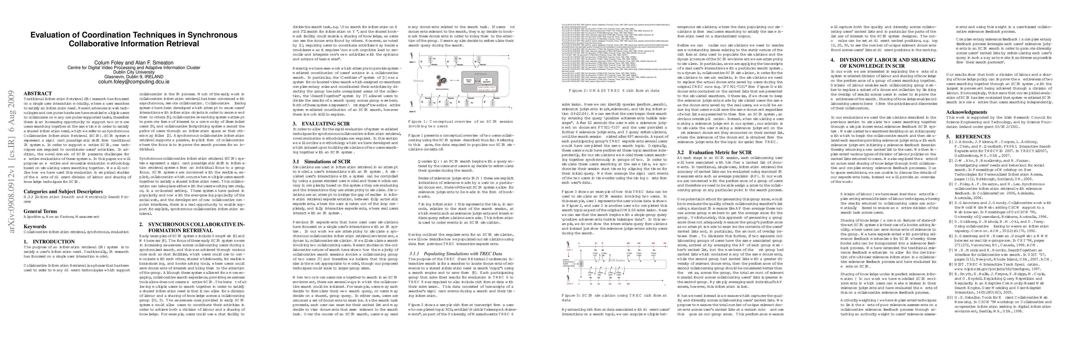 This paper proposes a methodology for evaluating coordination techniques in Synchronous Collaborative Information Retrieval (SCIR) systems, focusing on how different division of labour and knowledge sharing methods impact collaborative search efficiency. The study employs simulated user interactions to assess these techniques.