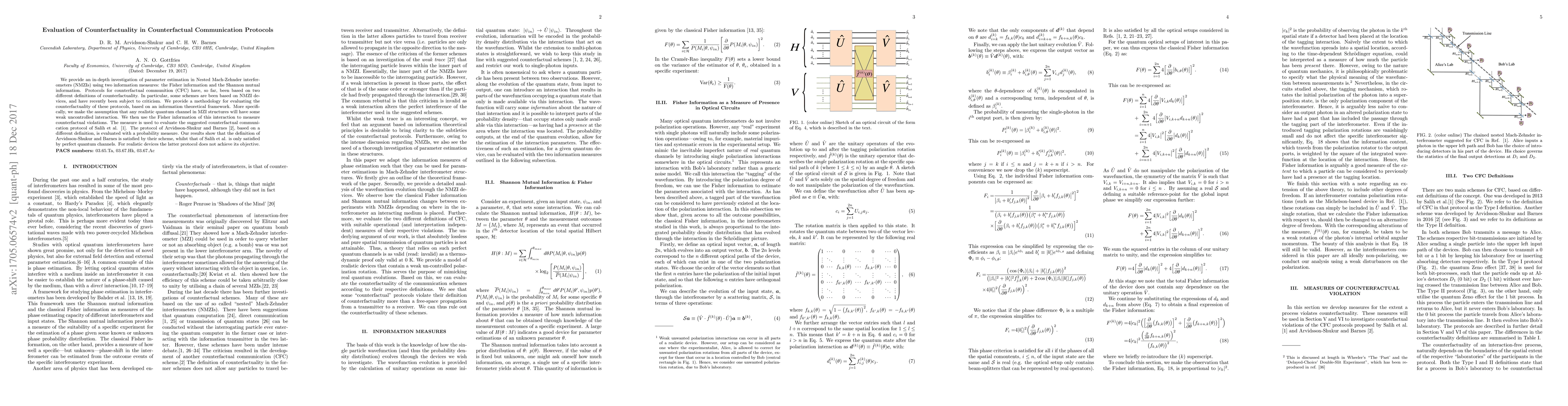 We provide an in-depth investigation of parameter estimation in Nested Mach-Zehnder interferometers (NMZIs) using two information measures: the Shannon mutual information and the classical Fisher information. Protocols for counterfactual communition (CFC) have, so far, been based on two different definitions of counterfactuality. In particular, some schemes have been based on NMZI devices, but have recently been subject to criticism. We provide a methodology for evaluating the counterfactuality of these protocols, based on an information theoretical framework. More specifically, we make the assumption that any realistic quantum channel in MZI structures will have some weak uncontrolled interaction, and we use the Fisher information to measure counterfactual violations. The measure is used to evaluate the suggested counterfactual communication protocol by Salih et al. \cite{Salih13}. The protocol of Arvidsson-Shukur and Barnes \cite{ArvShukur16}, based on a different definition, is evaluated with a probability measure. Our results show that the definition of Arvidsson-Shukur and Barnes is satisfied by their scheme, whilst that of Salih et al. is only satisfied by perfect quantum channels. For realistic devices the latter protocol does not achieve its objective.