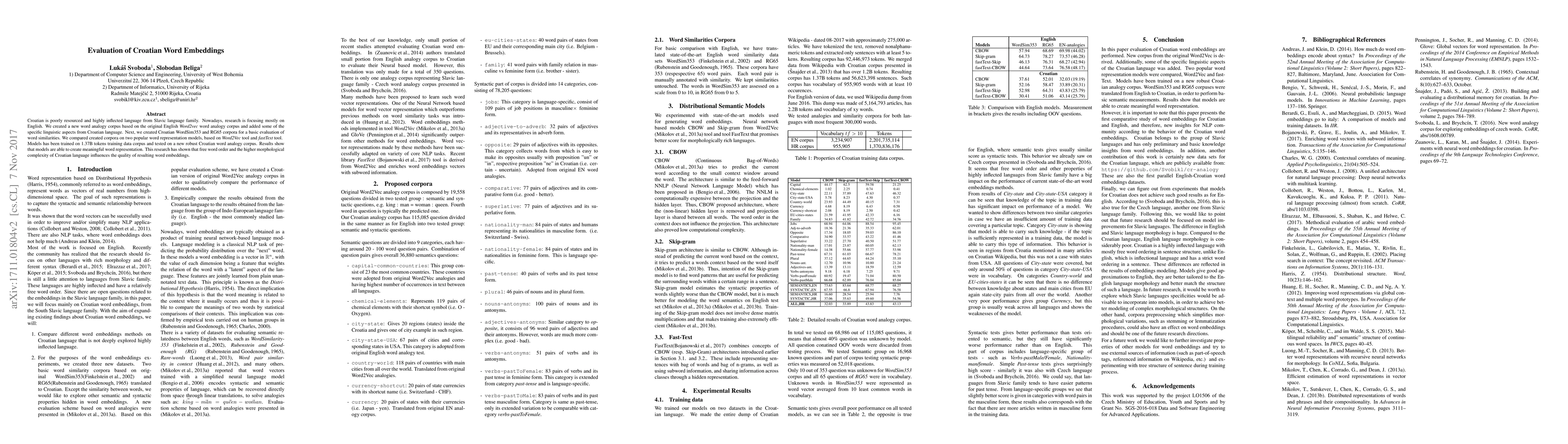 Croatian is poorly resourced and highly inflected language from Slavic language family. Nowadays, research is focusing mostly on English. We created a new word analogy corpus based on the original English Word2vec word analogy corpus and added some of the specific linguistic aspects from Croatian language. Next, we created Croatian WordSim353 and RG65 corpora for a basic evaluation of word similarities. We compared created corpora on two popular word representation models, based on Word2Vec tool and fastText tool. Models has been trained on 1.37B tokens training data corpus and tested on a new robust Croatian word analogy corpus. Results show that models are able to create meaningful word representation. This research has shown that free word order and the higher morphological complexity of Croatian language influences the quality of resulting word embeddings.