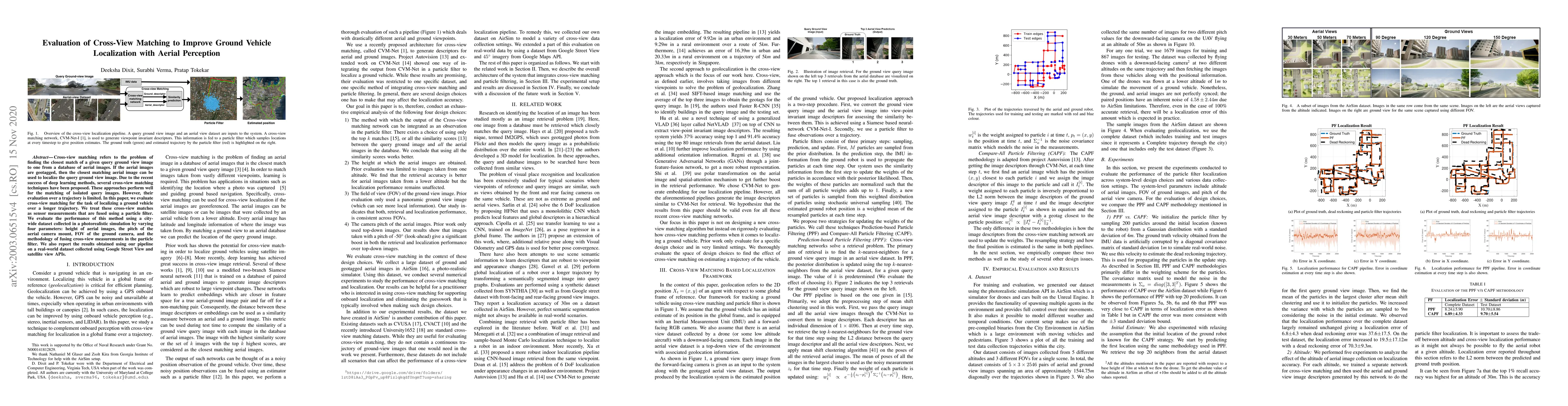 This paper evaluates cross-view matching techniques for localizing ground vehicles over extended trajectories using aerial images. The study assesses the performance of these techniques through a particle filter fusion of cross-view matches, analyzing the impact of various parameters on localization accuracy using both simulated and real-world datasets.