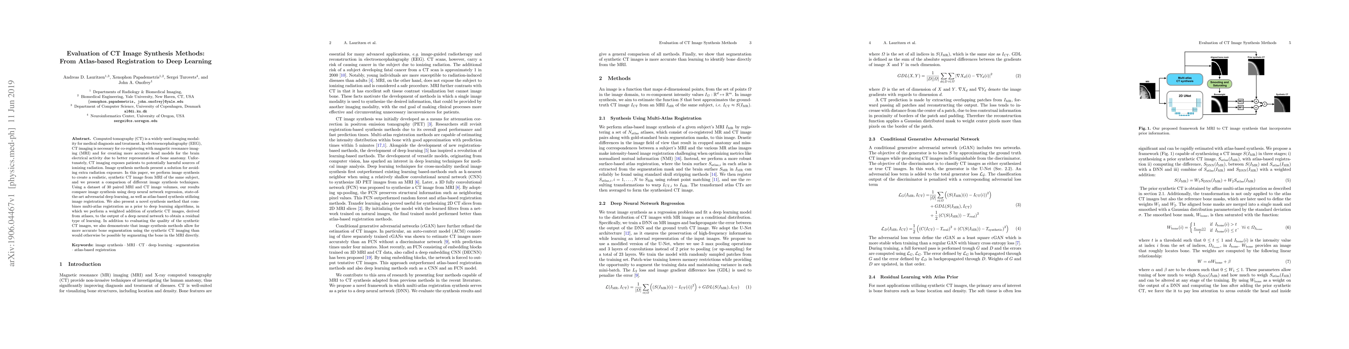 This paper evaluates various CT image synthesis methods, including deep learning and atlas-based registration, to create synthetic CT images from MRI data, aiming to avoid ionizing radiation exposure. The study compares these techniques and introduces a novel hybrid approach combining multi-atlas registration with deep learning for improved synthetic CT quality and bone segmentation accuracy.