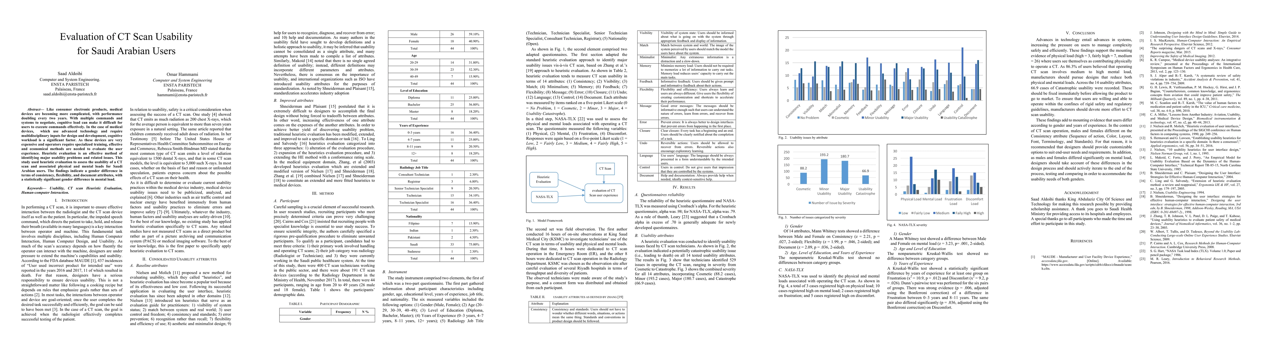 - Like consumer electronic products, medical devices are becoming more complicated, with performance doubling every two years. With multiple commands and systems to negotiate, cognitive load can make it difficult for users to execute commands effectively. In the case of medical devices, which use advanced technology and require multidisciplinary inputs for design and development, cognitive workload is a significant factor. As these devices are very expensive and operators require specialized training, effective and economical methods are needed to evaluate the user experience. Heuristic evaluation is an effective method of identifying major usability problems and related issues. This study used heuristic evaluation to assess the usability of a CT scan and associated physical and mental loads for Saudi Arabian users. The findings indicate a gender difference in terms of consistency, flexibility, and document attributes, with a statistically significant gender difference in mental load.