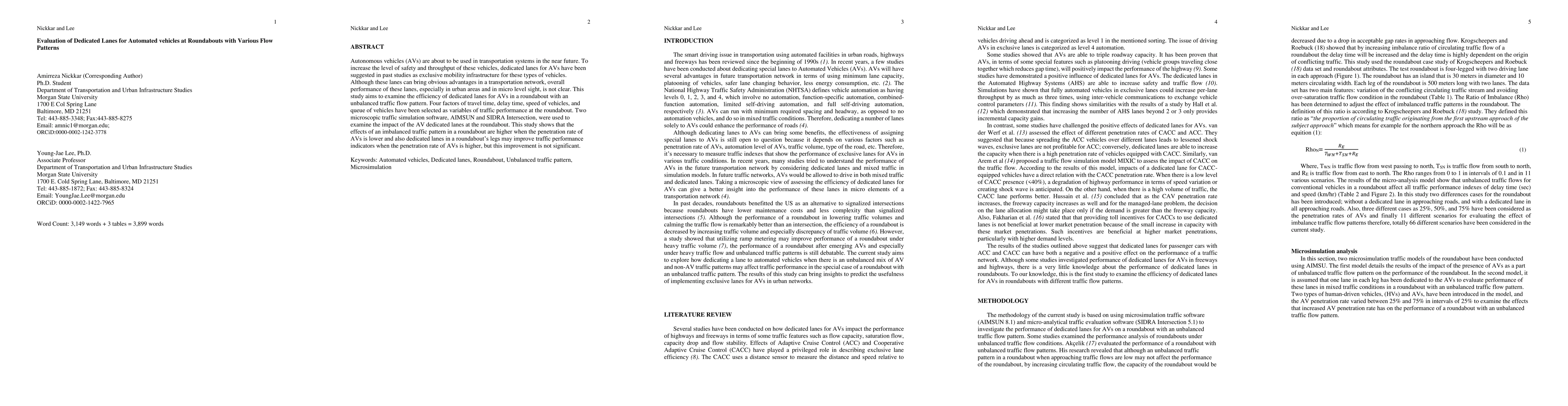 Autonomous vehicles (AVs) are about to be used in transportation systems in the near future. To increase the level of safety and throughput of these vehicles, dedicated lanes for AVs have been suggested in past studies as exclusive mobility infrastructure for these types of vehicles. Although these lanes can bring obvious advantages in a transportation network, overall performance of these lanes, especially in urban areas and in micro level sight, is not clear. This study aims to examine the efficiency of dedicated lanes for AVs in roundabout with an unbalanced traffic flow pattern. Four factors of travel time, delay time, speed of vehicles, and queue of vehicles have been selected as variables of traffic performance at the roundabout. Two microscopic traffic simulation software, AIMSUN and SIDRA Intersection, were used to examine the impact of the AV dedicated lanes at the roundabout. This study shows that the effects of an imbalanced traffic pattern in a roundabout are higher when the penetration rate of AVs is lower and also dedicated lanes in roundabout's leg may improve traffic performance indicators when the penetration rate of AVs is higher, but this improvement is not significant.