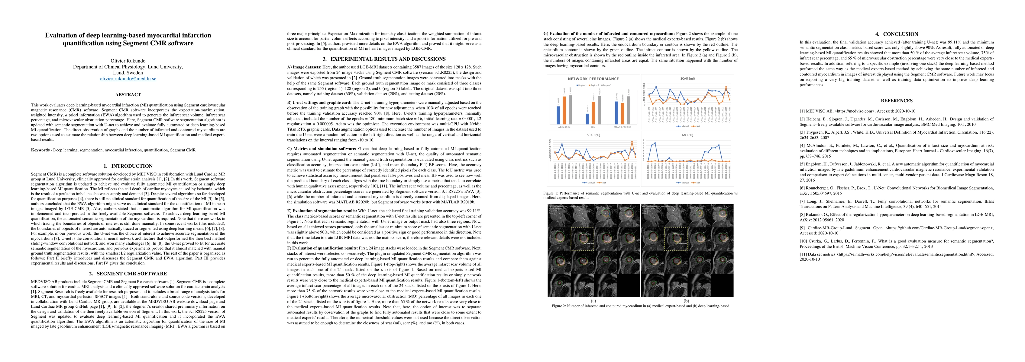 This paper evaluates the use of deep learning, specifically a U-net semantic segmentation algorithm, to quantify myocardial infarction (MI) using Segment CMR software, comparing its results with those from medical experts. The study assesses the accuracy of automated MI quantification in terms of infarct scar volume and percentage.
