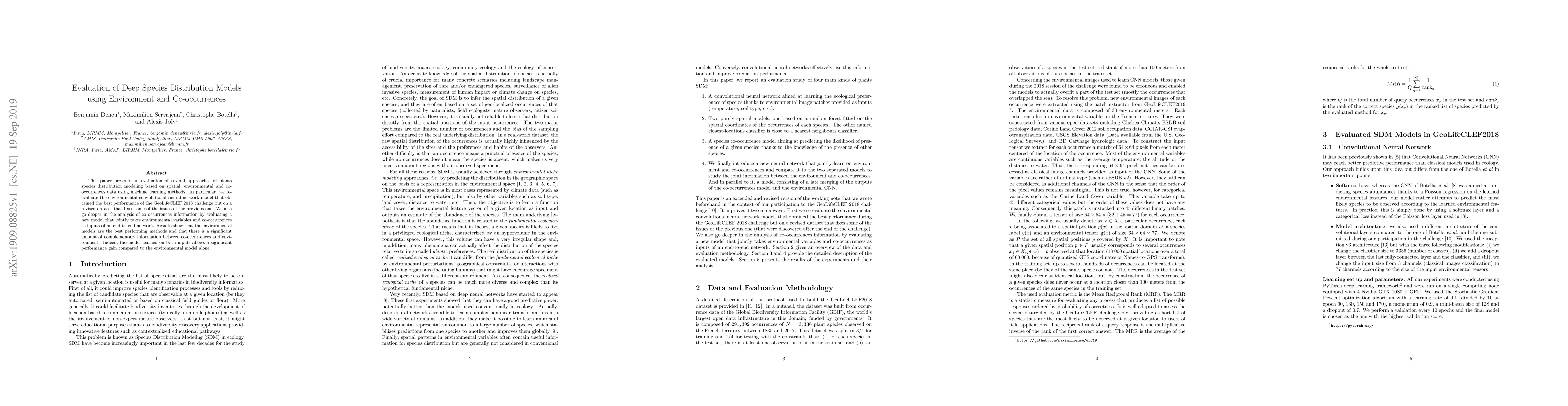 This paper evaluates deep species distribution models using environmental and co-occurrence data, finding that environmental models perform best, while a new model incorporating both environmental and co-occurrence data shows significant performance gains.