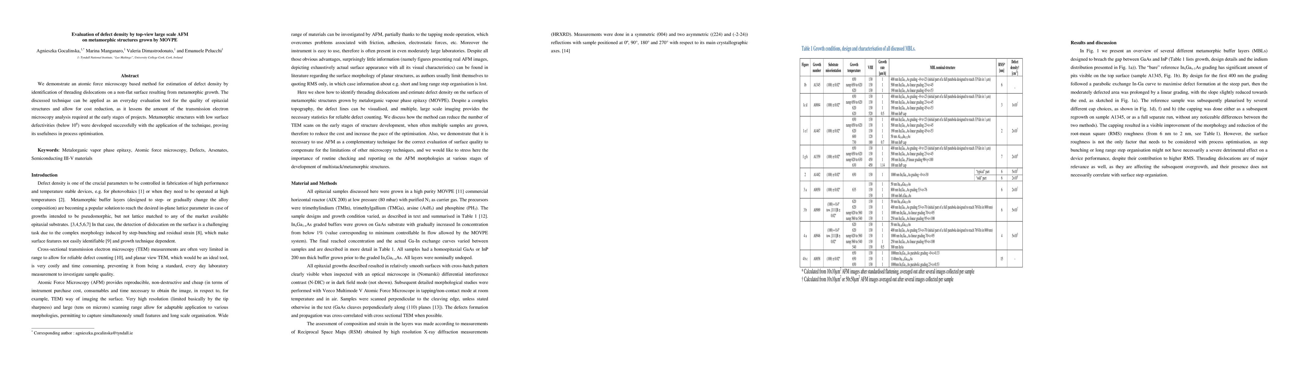 This paper presents an atomic force microscopy (AFM) method for estimating defect density in metamorphic structures grown by metal-organic vapor phase epitaxy (MOVPE), identifying threading dislocations on non-flat surfaces. The technique reduces the need for costly transmission electron microscopy analysis, optimizing epitaxial structure quality and lowering project costs.